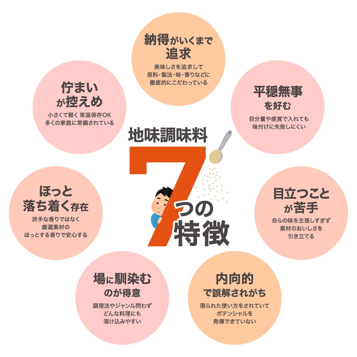 地味調味料とは、素材の味を引き立てるのが得意で、料理への汎用性が高いといった7つの特徴を持った調味料を表す当社の造語です。具体的には、下記のような調味料を指しています。