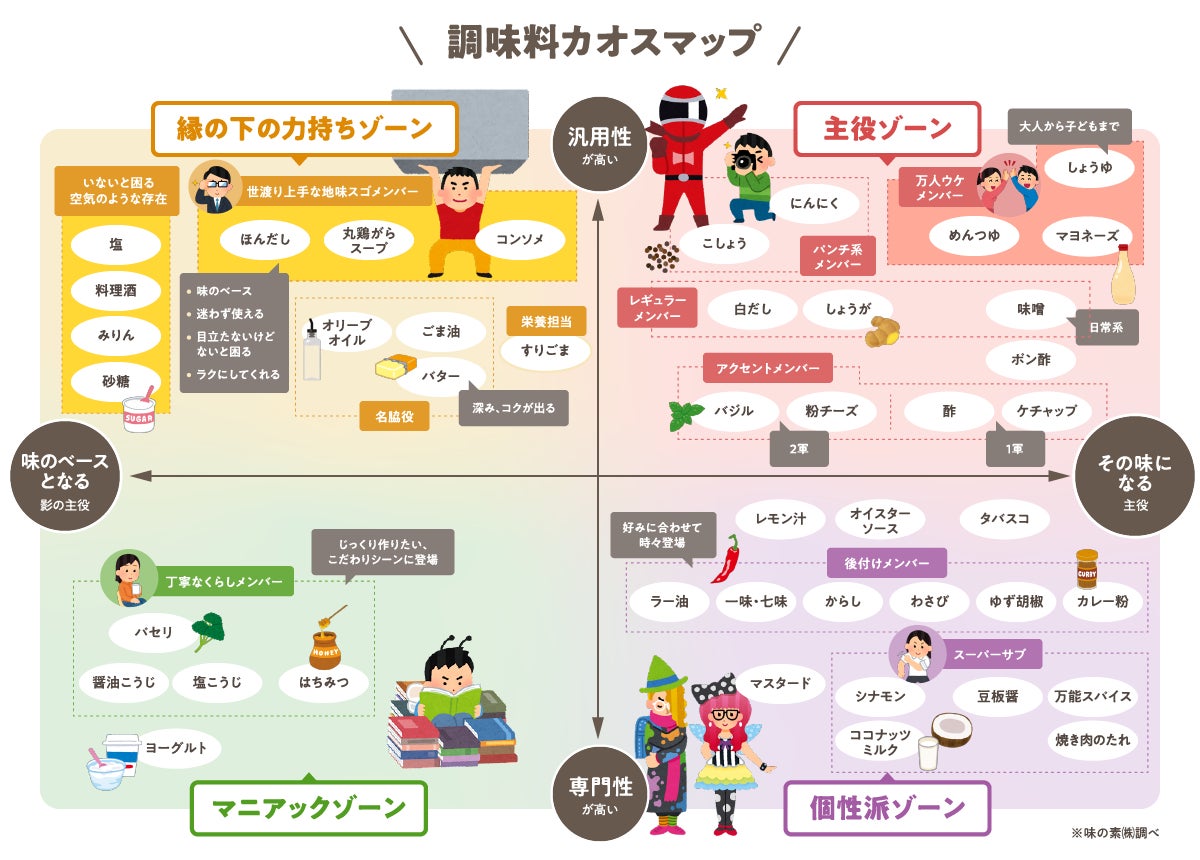 カオスマップでは、調味料のカテゴリを、汎用性が高く味の主役となる『主役ゾーン』、同じく汎用性が高く味のベースを作る『縁の下の力持ちゾーン』、専門性が高く味の主役となる『個性派ゾーン』、同じく専門性が高く味のベースを作る『マニアックゾーン』の4つに分類しました。