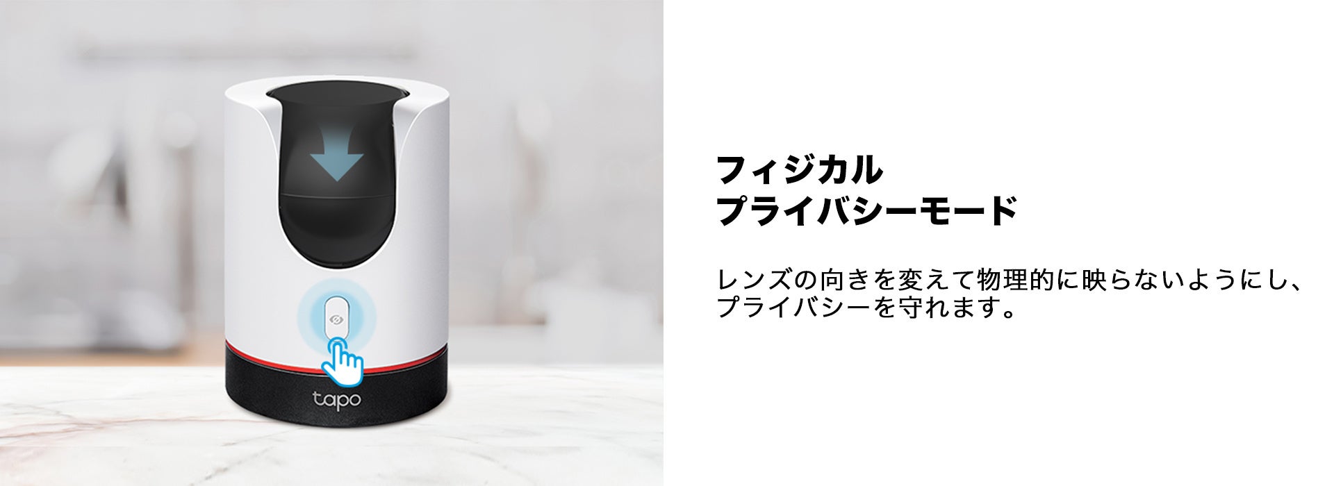 「Tapo C225」では、ワンタッチでカメラのレンズを隠すことができるフィジカルプライバシーモードを新たに搭載。レンズの向きを物理的に変えて撮影を止められるため、視覚的にも安心して利用することができます。
