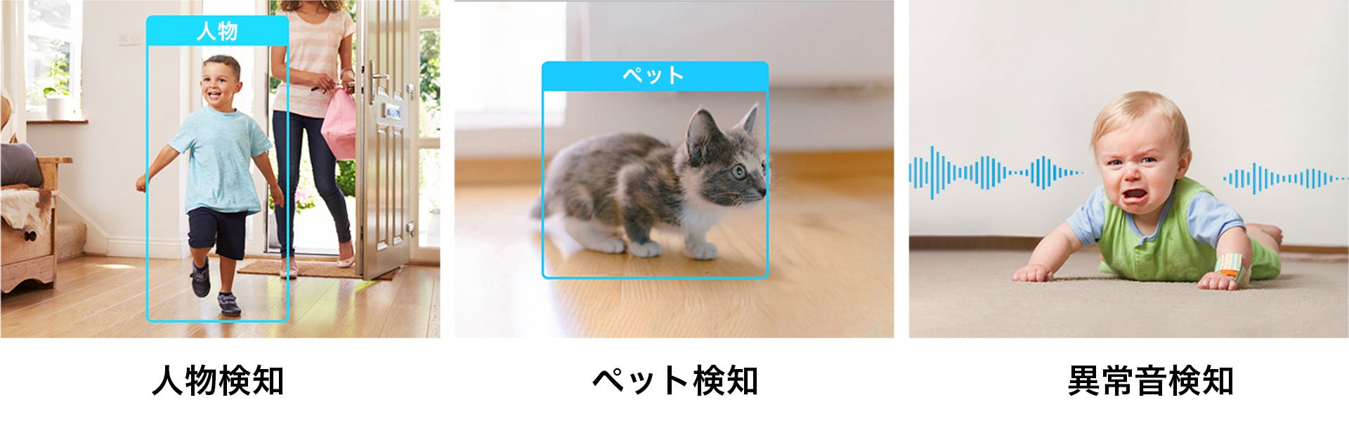 「Tapo C225」のスマートAIは、人物・ペット・車両を賢く認識し、必要に応じてユーザーへお知らせします。物体だけでなく、赤ちゃんの大きな泣き声等の異常音も検知することが可能です。