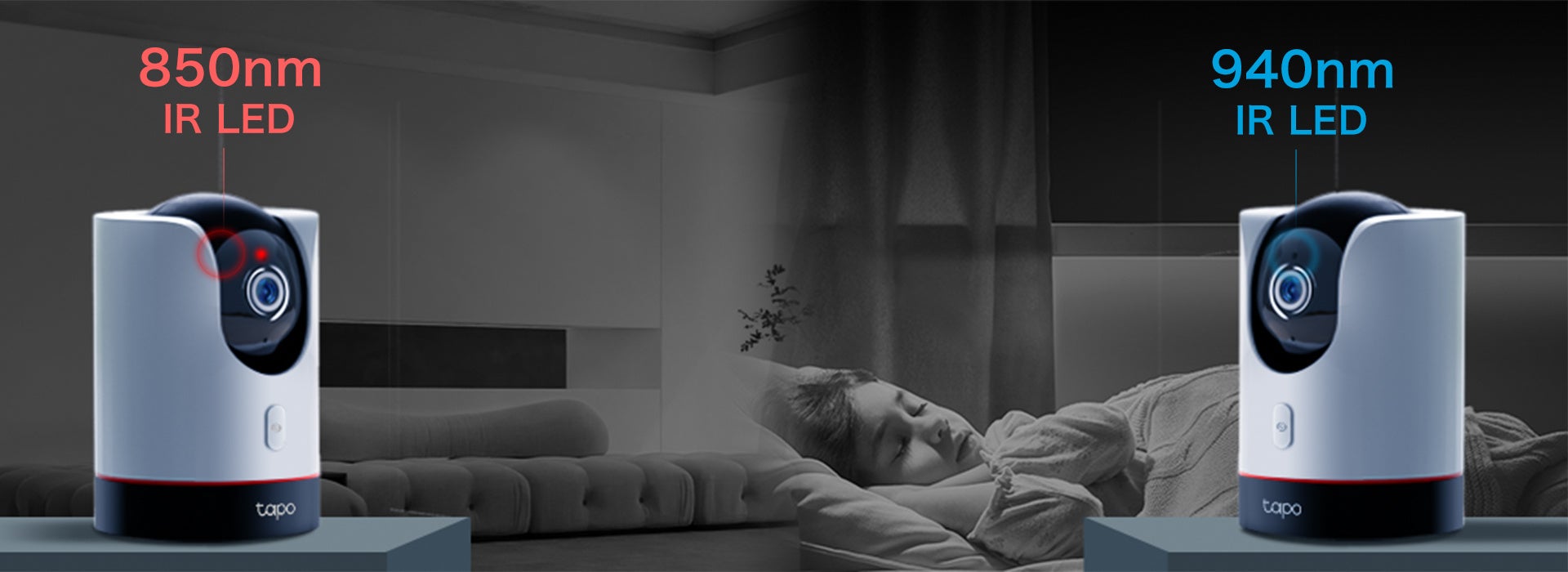 「Tapo C225」は、4MPの高画質で鮮明な映像をお届けします。暗闇でも撮影可能なナイトビジョンにも対応し、850nm IRと940nm IRの2種類のLEDを搭載。850nmは遠くまで見渡すことができ、940nmはLEDがうっすらと赤く光らないため、お休み中のお子様の見守りに最適です。