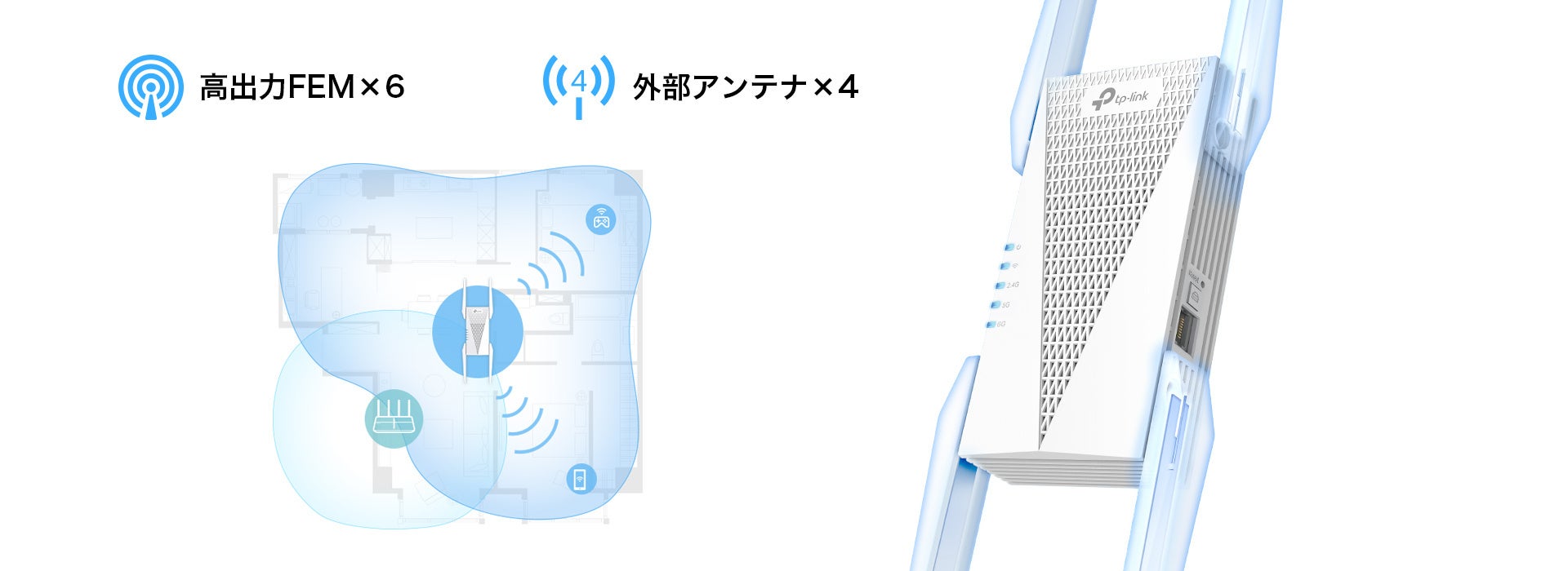 「RE815XE」では、特徴的な4本の外部アンテナを搭載。6本の高出力FEMが、接続デバイスに向けて信号を集中的に送るビームフォーミング技術と合わせて、より遠くまでWi-Fiのカバー範囲を広げます。