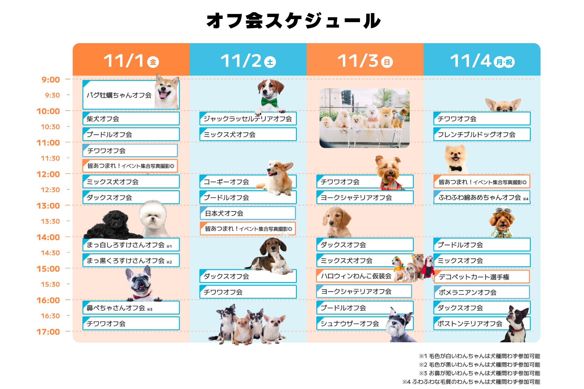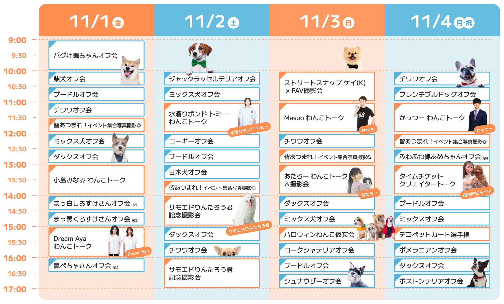 イベント公式Instagramからフォロワーの皆様に募集した、犬種別オフ会のタイムテーブルを公開しました。カメラマンによる集合写真撮影や参加者様への特典プレゼントもあります。事前予約は不要、ステージ前に集合するだけで参加可能です。