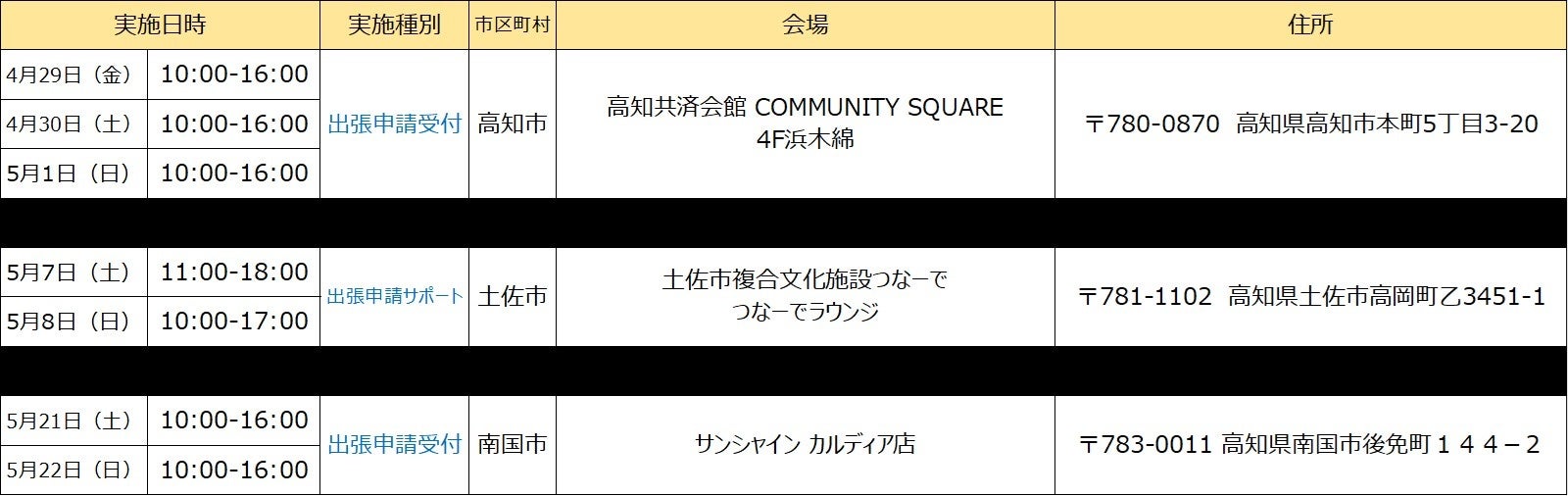 ※開催場所の調整状況や新型コロナウィルスの感染状況等により、「出張申請受付」及び「出張申請サポート」の開催を中止・延期、または実施内容が変更となる可能性がございます。