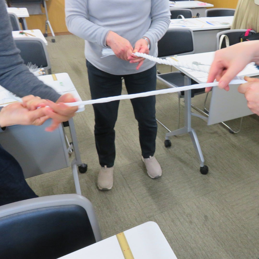 【第1回講座】受講者同士で協力し合い、白を基調とした土台のしめ縄の輪飾りを作成しました。