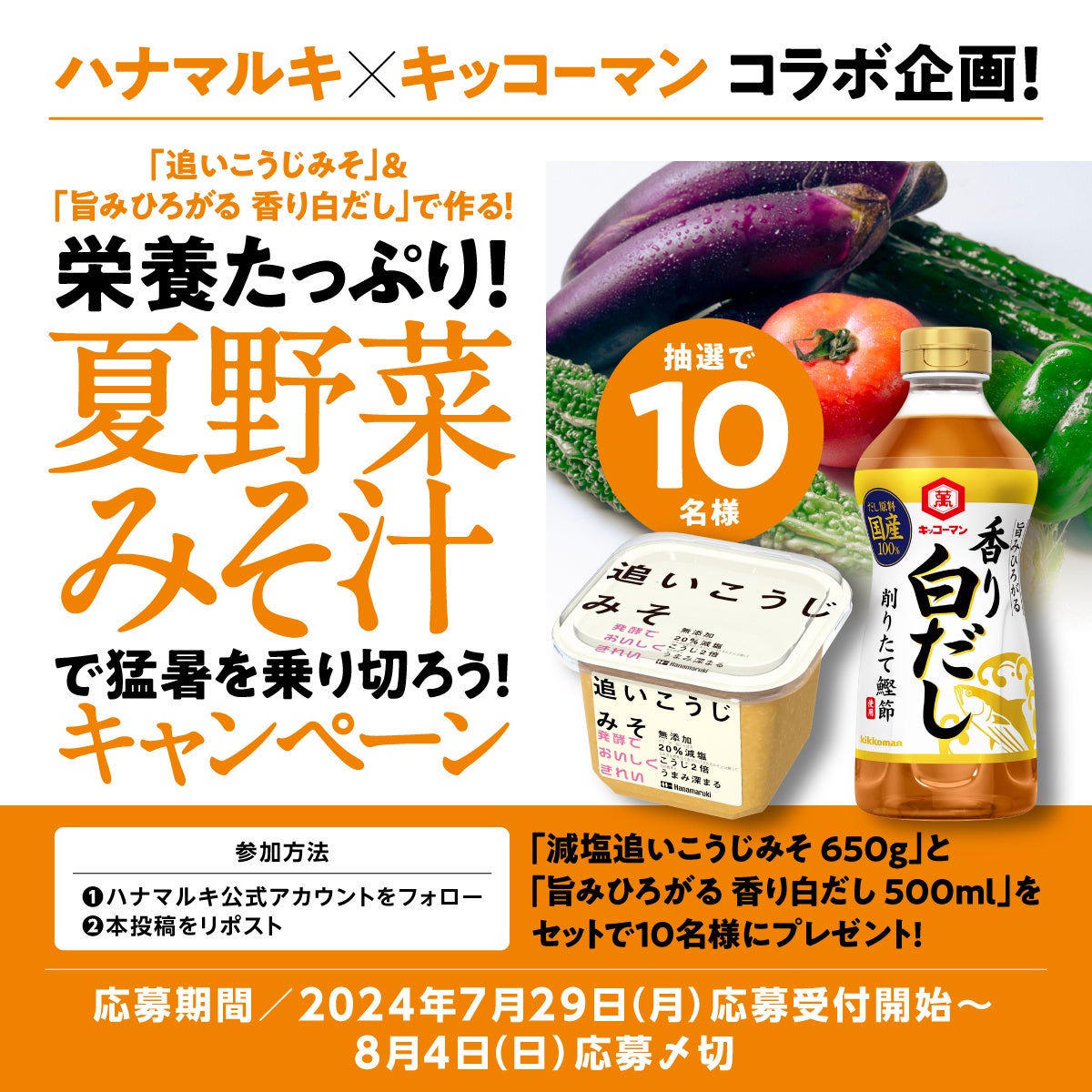 味噌・醸造製品メーカーのハナマルキ株式会社(本社:長野県伊那市、代表取締役社長:花岡周一郎、以下当社)は、キッコーマン食品株式会社(本社:東京都港区、代表取締役社長:中野祥三郎、以下キッコーマン)とのコラボレーション企画として、7 月 29 日(月)より、当社公式 X アカウントにて夏のプレゼントキャンペーンを開始いたします。