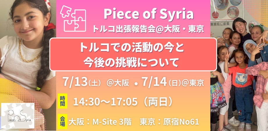 シリア北部とトルコ南部でシリア人の難民/国内避難民の子どもたちを対象に教育支援事業を行うNPO法人Piece of Syria(本部:大阪府大阪市、代表理事:中野貴行)は、2024年7月13に大阪、 14日に東京にて、「【トルコ出張報告会】トルコでの活動と今後の挑戦について」を開催いたします。