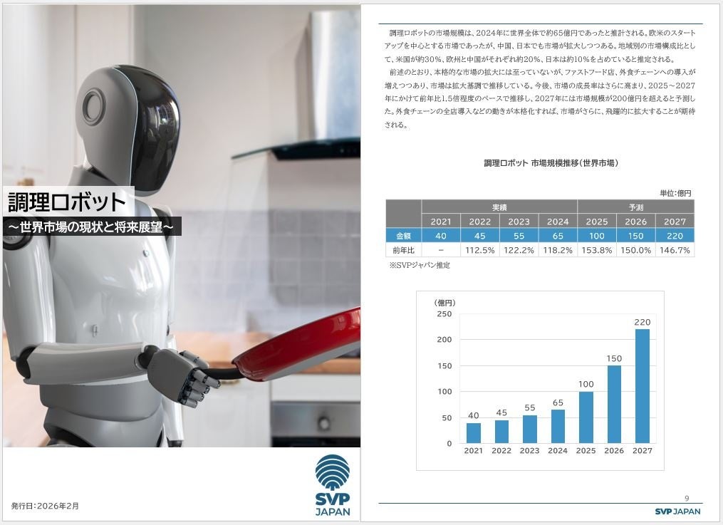 会員制マーケットリサーチサービスを提供している、株式会社SVPジャパン(本社:東京都中央区、代表取締役社長:橋本 雅、以下「SVPジャパン」)は、本日、SVP注目市場分析レポート「調理ロボット-世界市場の現状と将来展望-」を、会員企業向けに公開いたしました。