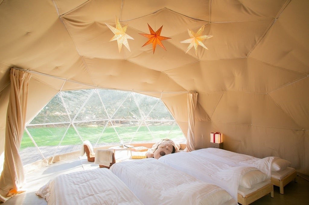 【glampark ヘルシーパル赤城の魅力③.冷暖房完備の広々としたドームで快適ステイ】
