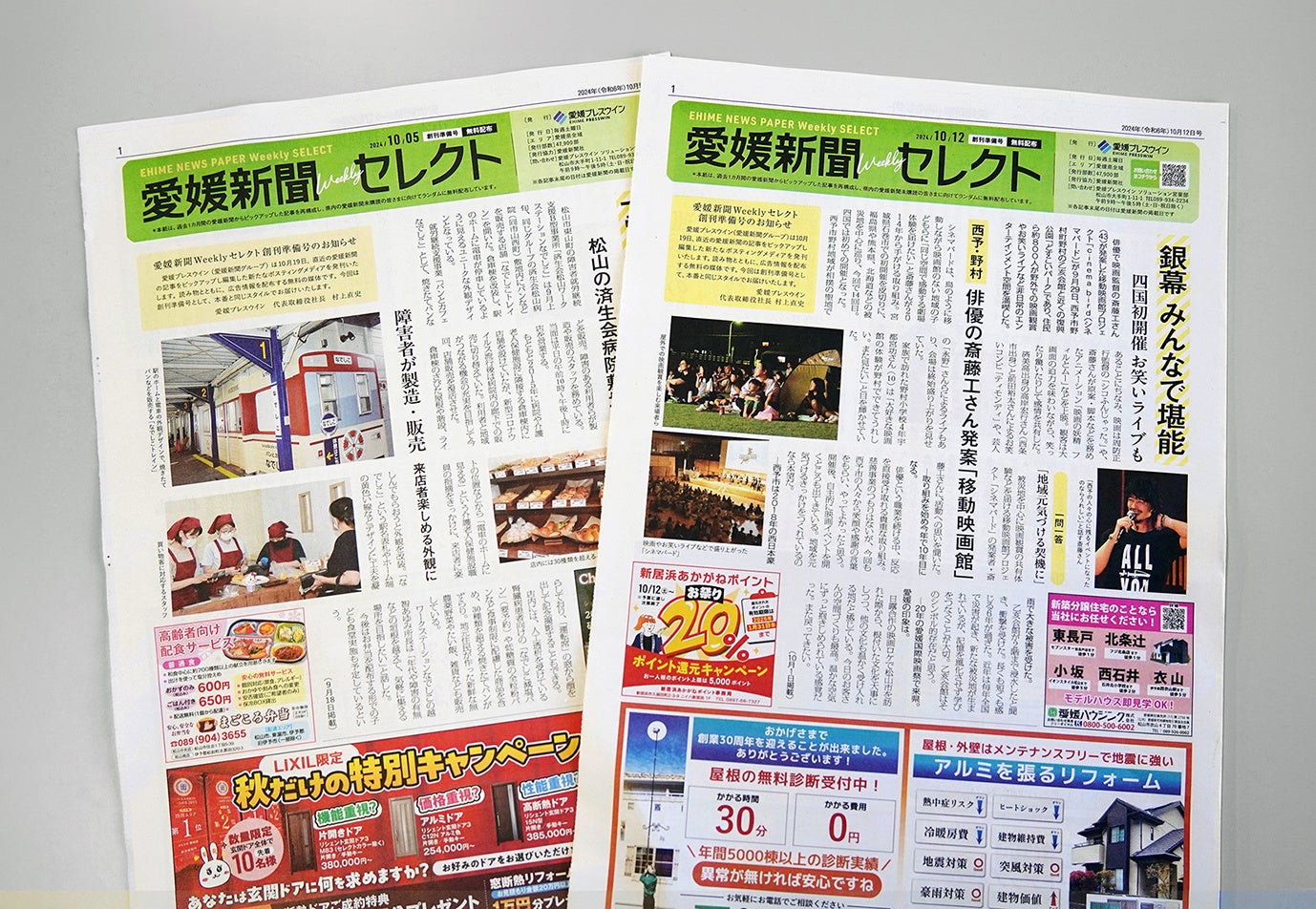 内容・狙い:新聞折り込み広告の追加サービスで、新聞折り込み広告と同時に申し込みを受け付け、新聞用と同じチラシをカバー紙に挟んで配布します。配布地域は愛媛新聞エリアサービス(販売所)のエリア単位で選ぶことができます。新聞折り込み広告との併用で世帯カバー率を拡大し、広告主の宣伝効果を高めることにつながります。10月19日のサービス開始に先駆け、10月5、12日にテスト配布を実施しました。