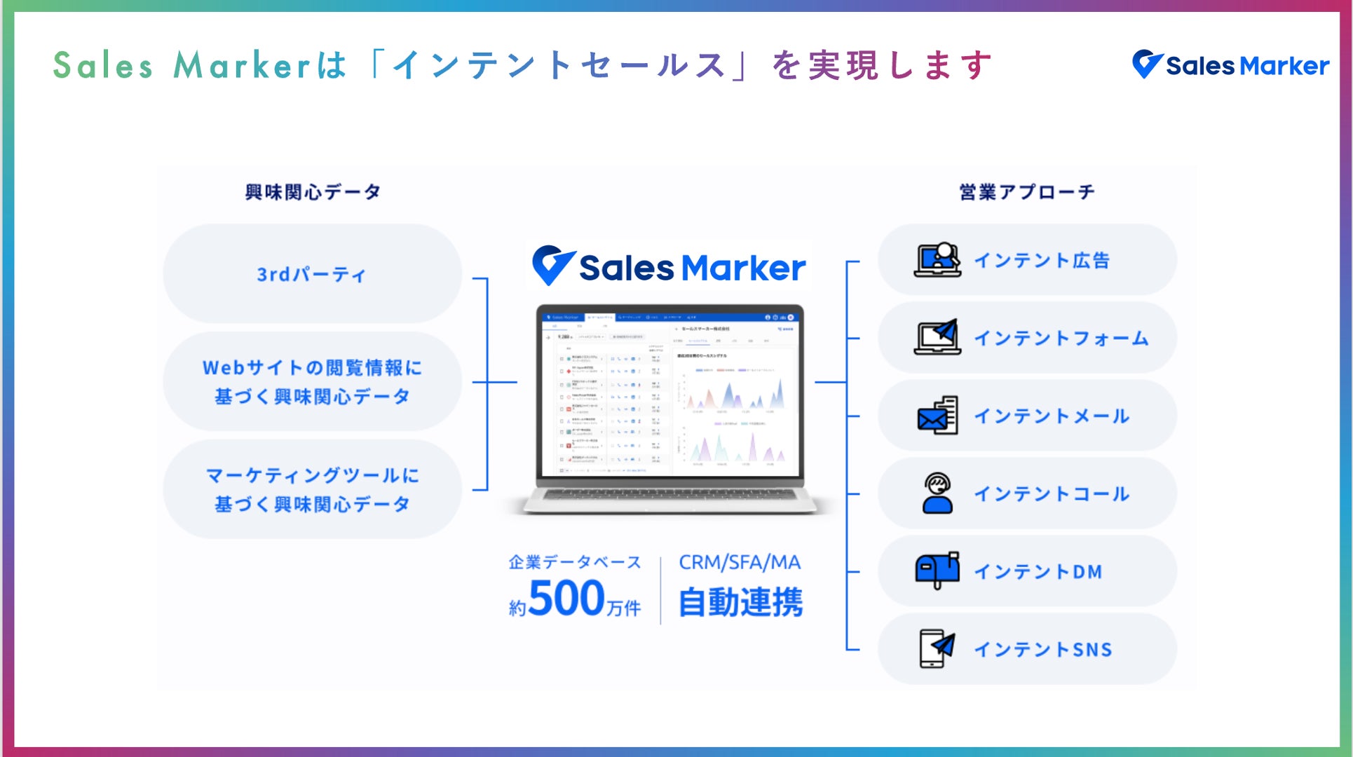当社は「既存の枠組みを超えた挑戦ができる世界を創る」をパーパスに掲げ、2022年3月よりBtoB向けセールスインテリジェンス『Sales Marker』の提供を開始しました。『Sales Marker』は、約500万件の企業データベースとインテント(興味関心)データとを組み合わせる事により今ニーズが顕在化している企業を見つけ、マルチチャネルで多角的なアプローチを行う事ができる、新時代の営業インテントセールスを国内で初めて実現し、多くの企業の成長に貢献してきました。