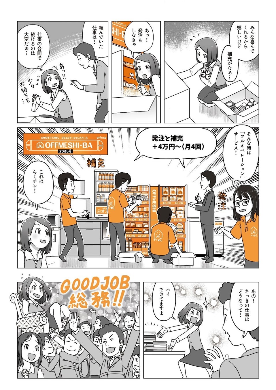 「オフめし」導入により職場の食事難民を救った総務担当の主人公が、新オプションを取り入れ、より効率的に「オフめし」を運営する興味深い話になっています。ぜひご覧ください。