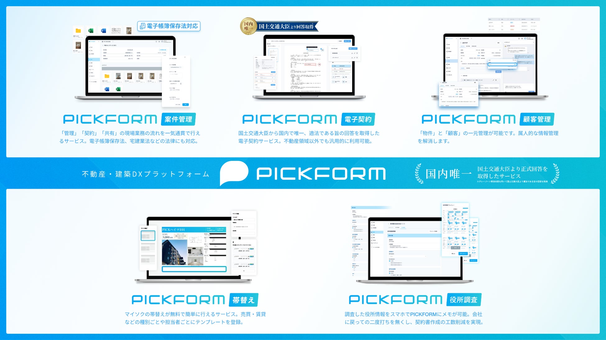 株式会社PICKは、「不動産取引を快適に、オープンに」をミッションに、不動産・建築業界のバリューチェーンが抱える構造的な課題に対し、2022年の「PICKFORM 電子契約」をリリース以来、不動産/建築の取引における「顧客体験の向上」を目指している企業です。「PICKFORM 電子契約」では国内で唯一国土交通大臣より正式回答をもらい、新しい法律に対しても安心して”適法に”利用いただけるサービスとして、導入企業が増えております。 今後は、不動産/建築業者の皆様の業務を1つでも多く解決するべく、業者の皆様の業務工程のあらゆるシーンにおけサービスのリリースを予定しています。PICKFORMは不動産・建築特化の Verticalオールインワン SaaSとして業界に貢献できるよう進化していきます。