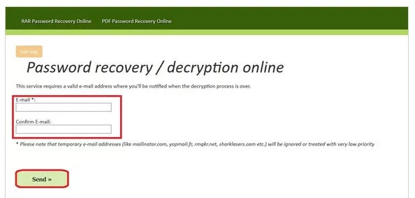 Step2:パスワードを解析するファイルを追加するとメールアドレスの登録画面に切り替わります。「E-mail、Confirm E-mail」にメールアドレスを入力後、「Send」を押すとパスワードの解析が始まります。