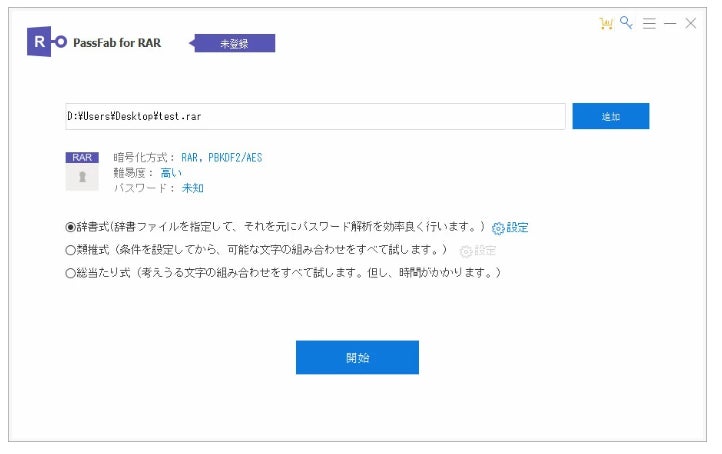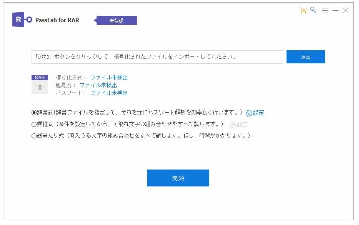 Step3:「辞書式、類推式、総当たり式」のどれかを選択し「開始」をクリックします。(辞書式、類推式は選択後、続けて「設定」から詳細を入力します)
