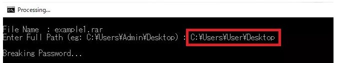 Step4:保存した「.bat」ファイルを開き、RARファイル名を入力して「Enter」キーを押して実行します。