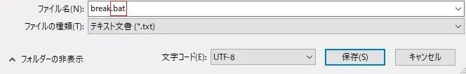 Step3:「名前を付けて保存」を選択後、拡張子を「.bat」に変更して「保存」を押します。