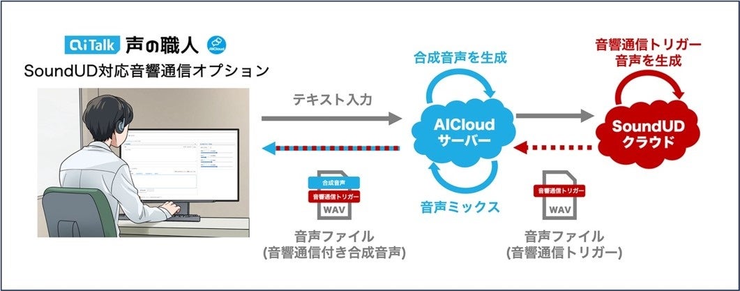 「SoundUD対応音響通信オプション」を使うと「声の職人クラウド版」のサービス上で作成する合成音声に、多言語のテキスト情報を表示可能にする音響通信トリガー音声を自動でMIXすることができます。