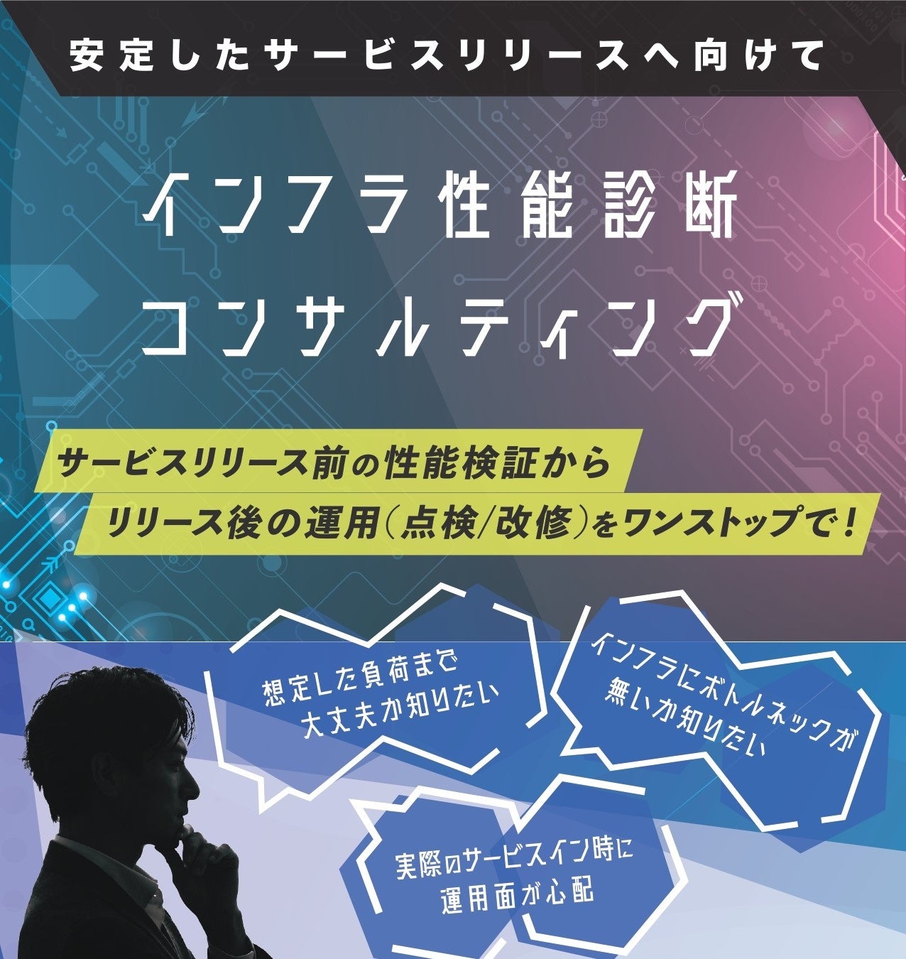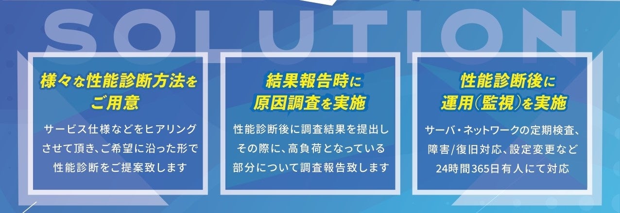 様々なインフラを取り扱って来たノウハウから、お客様のご要望に合わせた性能診断を実現いたします。また、サービスリリース時には運用のスペシャリストが、24時間365日の有人運用で対応させていただきます。まずはお気軽にお問い合わせください。