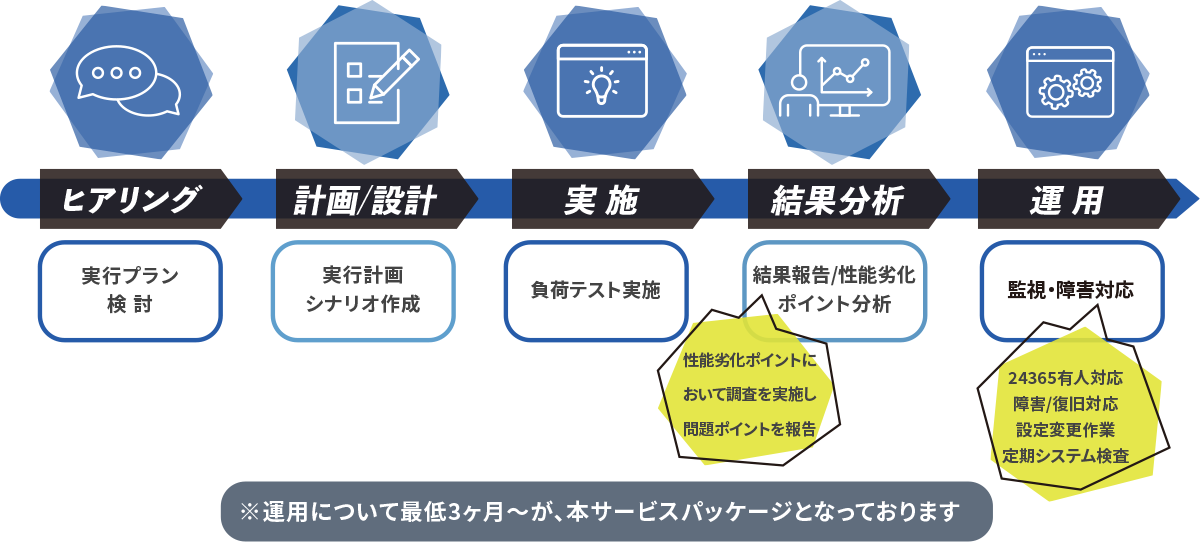 お客様にサービス仕様などのヒアリングをさせていただき、ご希望に沿った形で性能診断をご提案いたします。性能診断については、サービス仕様や最大ユーザー(activeユーザー/waitユーザー)を考慮したうえで実施いたします。