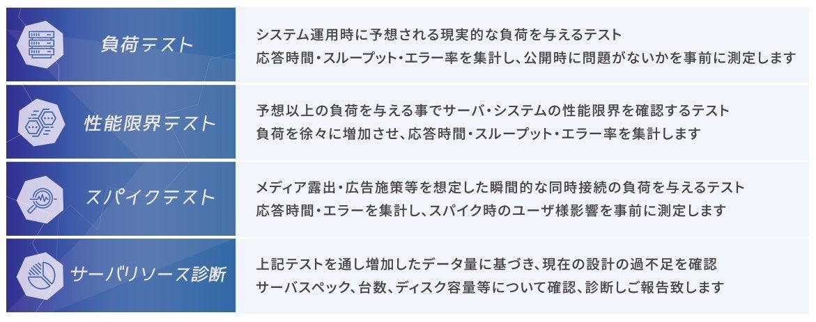 本サービスは、Webサービスやアプリをリリースする際に、性能診断からリリース後の運用までサポートするサービスです。お客様のご希望に沿った、最適な性能診断をご提案いたします。性能診断後の運用につきましても、定期検査、障害/復旧対応、設定変更など、24時間365日有人にて対応させていただきます。是非お気軽にお問い合わせください。