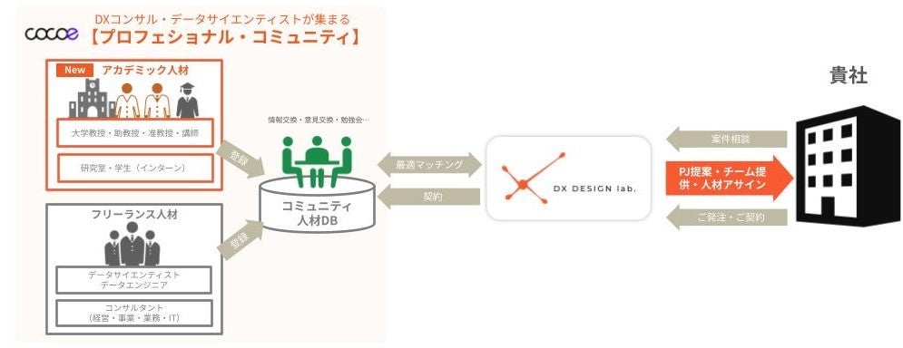 ココエでは、DXに関するありとあらゆる経営課題を念頭に置き、アカデミックやフリーランス人材と連携することで最先端技術を社会実装し、蓋然性の高い企業活動を支援しております。