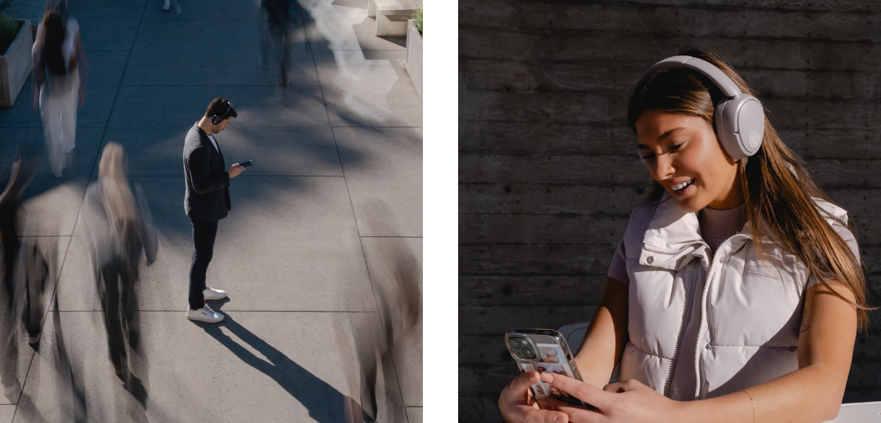 イヤホン内に仕込まれた4つのマイクが外音を的確に判断。スマートアクティブノイズキャンセルモード、外部音取り込みモード、オフの3パターンで、オーディオと外音のバランスを自在にコントロールします。
