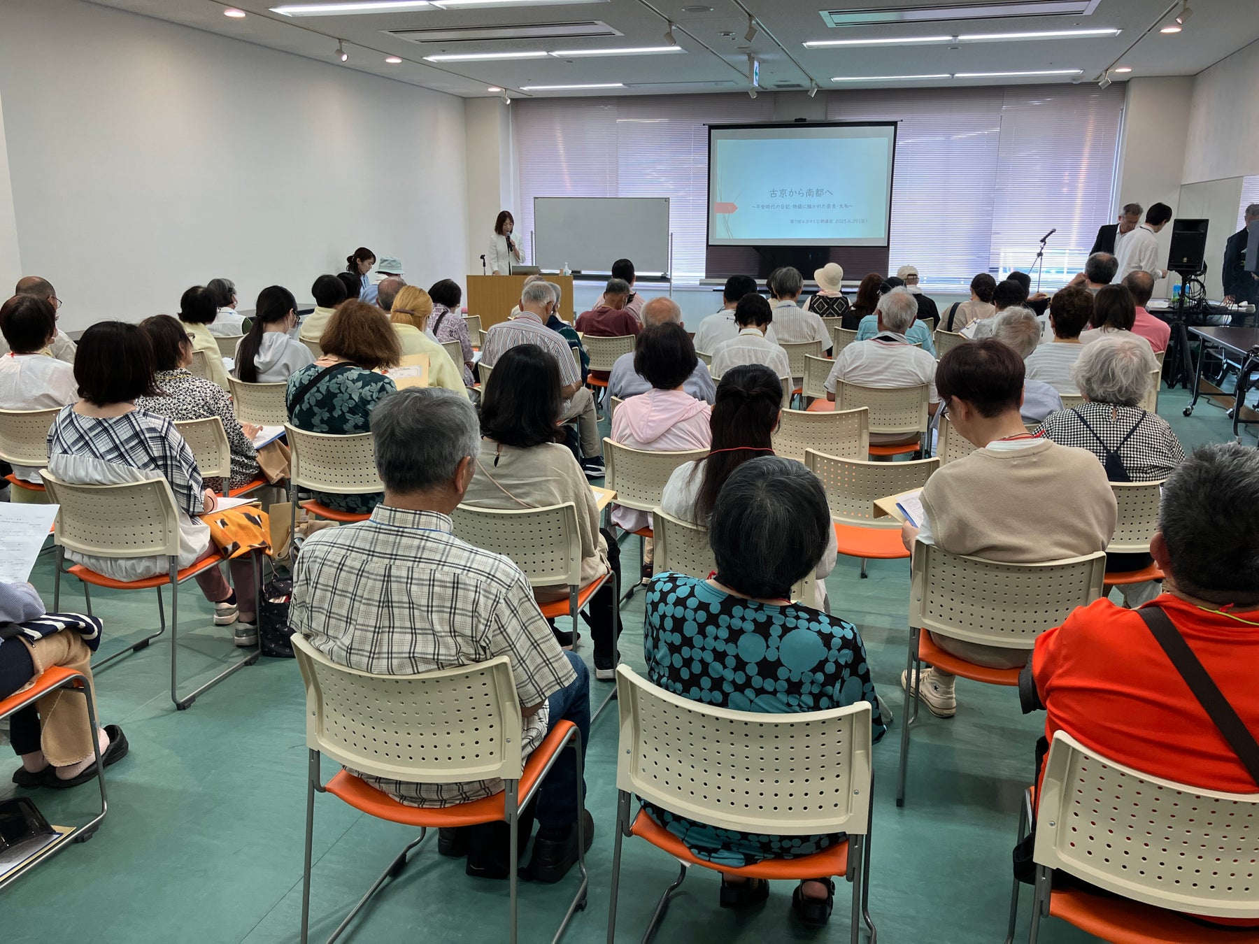西村先生は、奈良に都があった奈良時代から平安時代にかけて、「ナラ」の呼称が「南京」そして「南都」へと変化していく背景をテーマに話をされました。古今和歌集や大和物語、源氏物語といった文学作品に、「奈良」がどのように描かれているか解説がありました。そして、「南京」は寺院との関わりで使用され、平安時代に浸透したこと、12世紀半ばから「南都」の呼称が定着し、「南京」は減少していったという歴史の流れを説明されました。