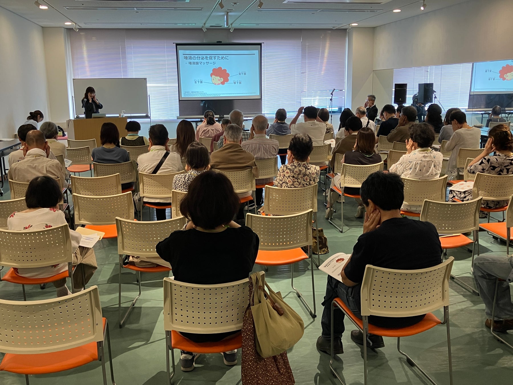 山本先生は、誤嚥性肺炎とはどのような症状か、その予防のためには口腔ケアやオーラルフレイル(噛んだり、飲み込んだり、話したりするための口腔の働きが衰えること)予防が重要であることを話されました。口腔ケアには唾液の分泌を促す必要があり、そのための唾液腺マッサージを実演していただきました。参加者の方々も一緒にマッサージを行い、効果を確認していました。また、オーラルフレイルを起こさないため、舌や唇を動かす「パタカラ体操」や舌のパワーをつける体操の実演も行い、参加者の方々も熱心に取り組んでいました。