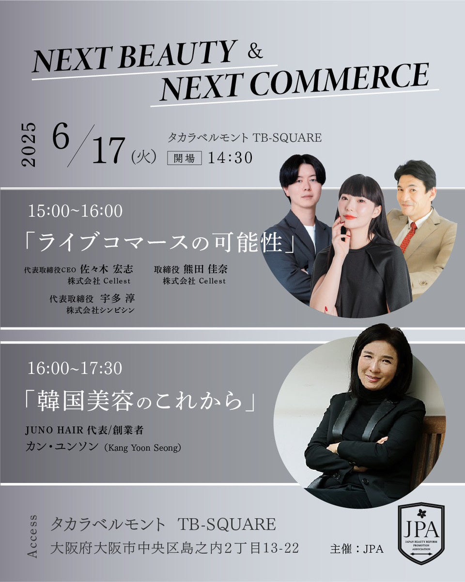 日本におけるライブコマースのインフラ化を目指す株式会社Cellest(本社:大阪府大阪市、代表取締役CEO:佐々木 宏志、以下当社)は、2025年6月17日(火)、一般社団法人日本美容改革推進協会(所在地:大阪府大阪市、代表理事:坂口貴徳、以下JPA)が主催する美容業界向けセミナー「NEXT BEAUTY & NEXT COMMERCE」に、当社代表取締役CEO 佐々木宏志と取締役 熊田佳奈が登壇することをお知らせします。