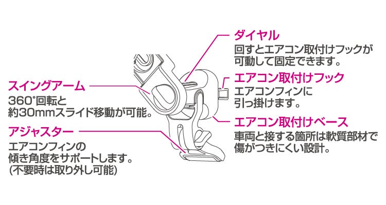 スイングアームで360°回転とスライド移動でエアコンの風を妨げず取り付けできます。