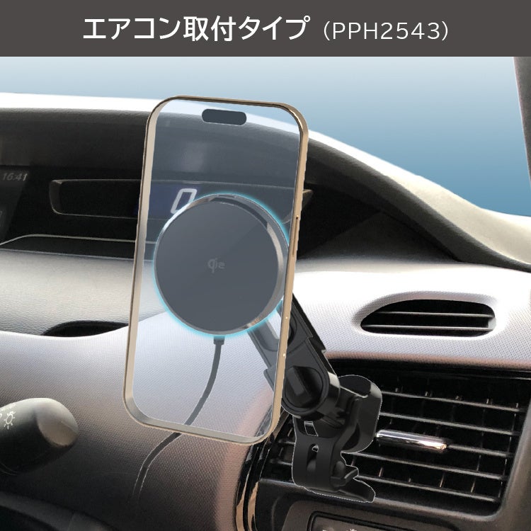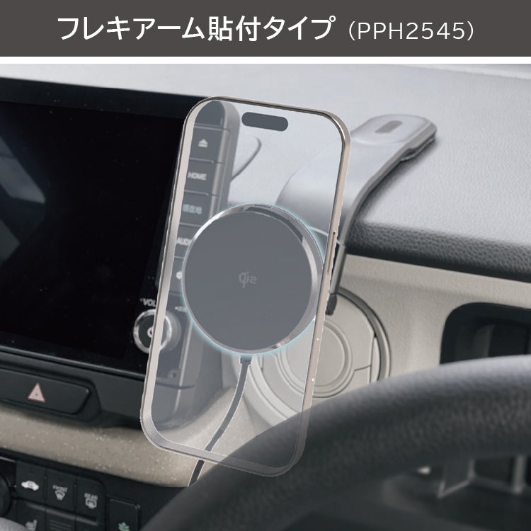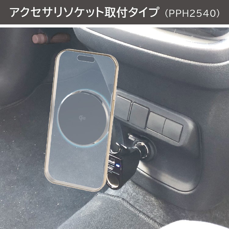 Qi2対応のワイヤレス充電マグネットスマホホルダーで、4つの取付タイプが同時発売。アクセサリソケット取付タイプ(PPH2540)、吸盤タイプ(PPH2542)、エアコン取付タイプ(PPH2543)、貼付けタイプ(PPH2545)