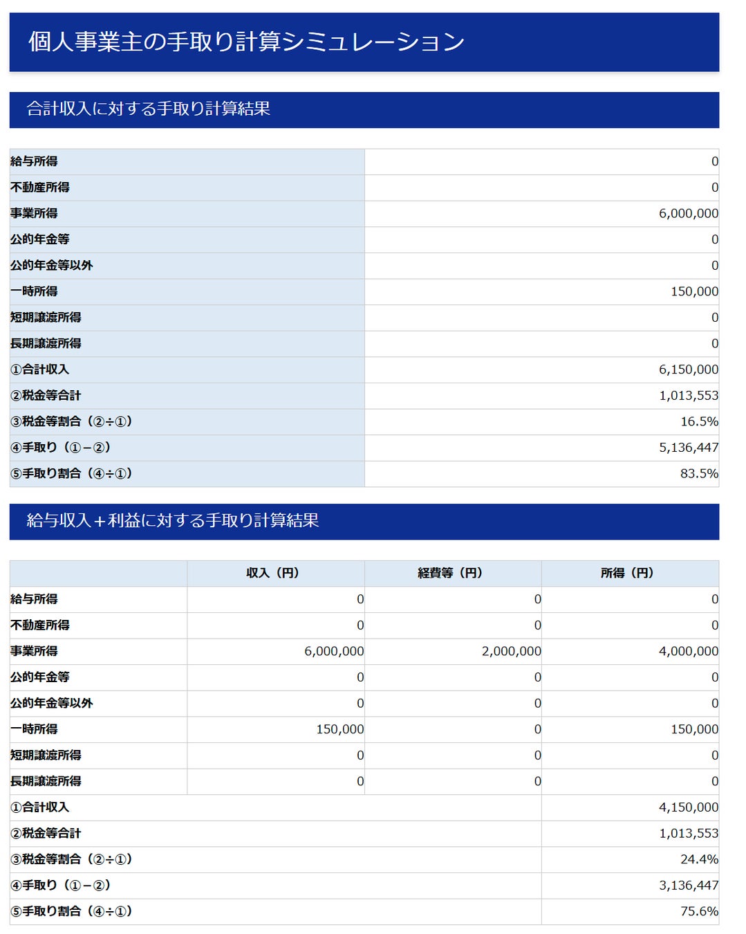 以下のとおり、税額や手取りなどのシュミレーション結果が表示されます。