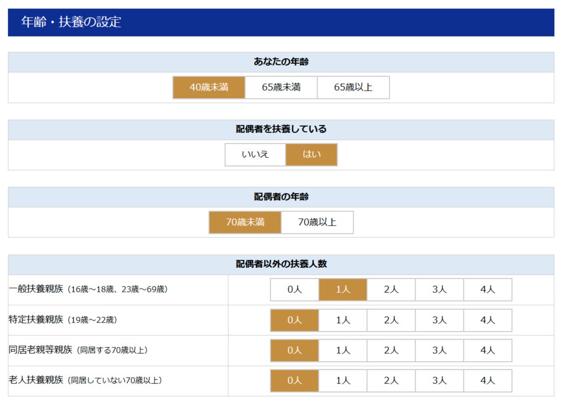 「個人事業主の確定申告・税金計算シミュレーション」ツールは、年齢・扶養の設定からスタートします。年齢や扶養の状況についてご選択ください。