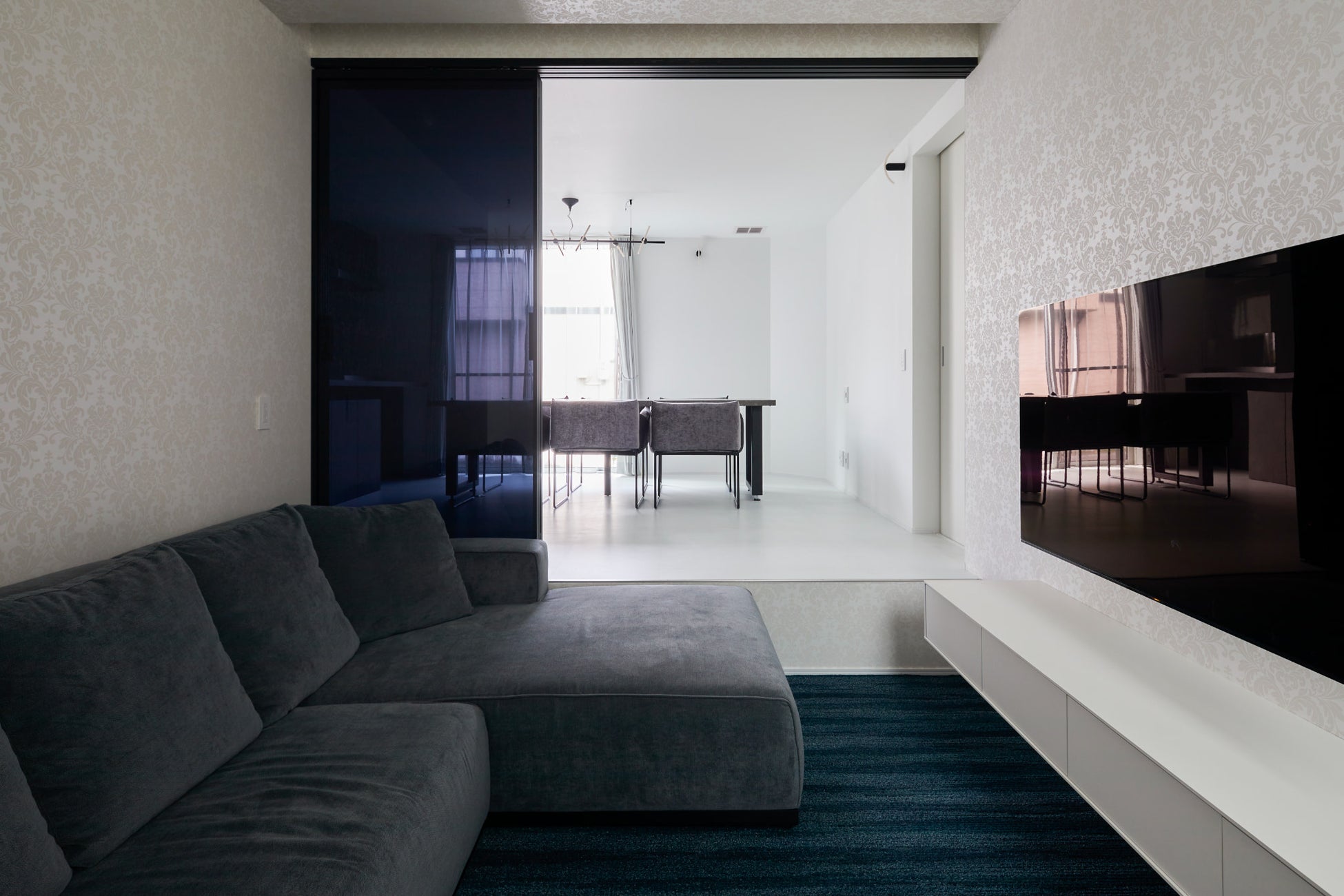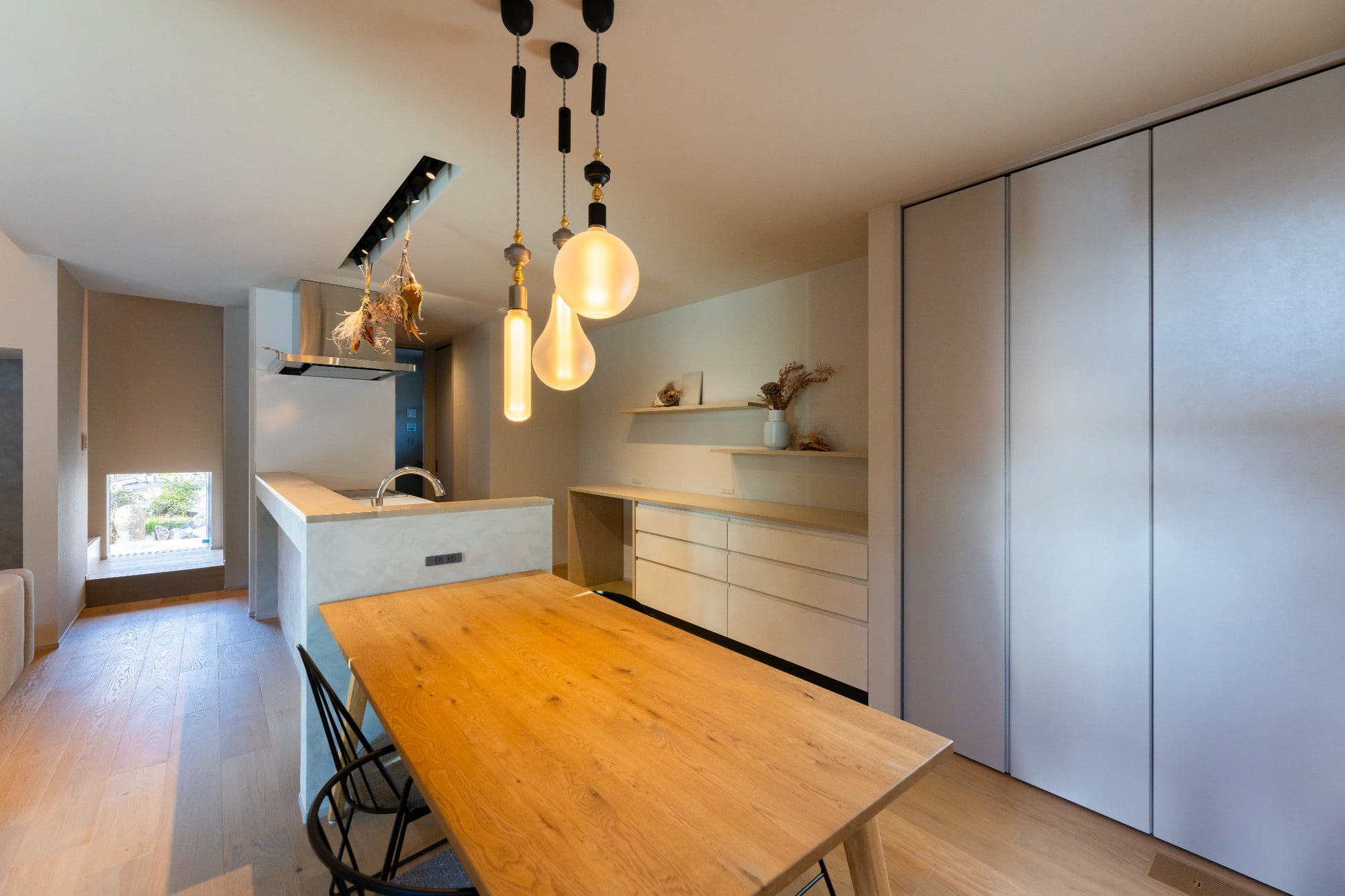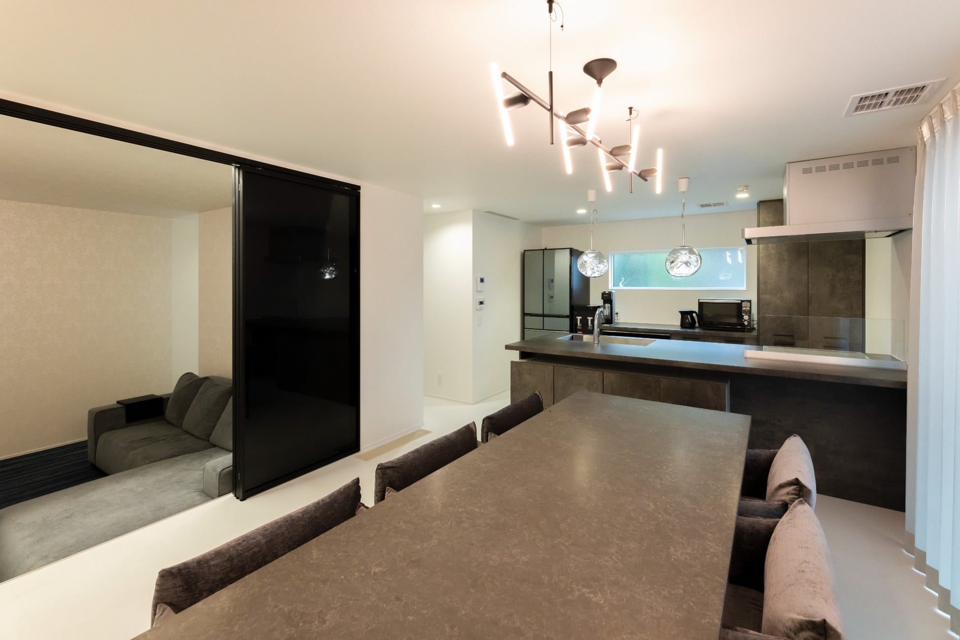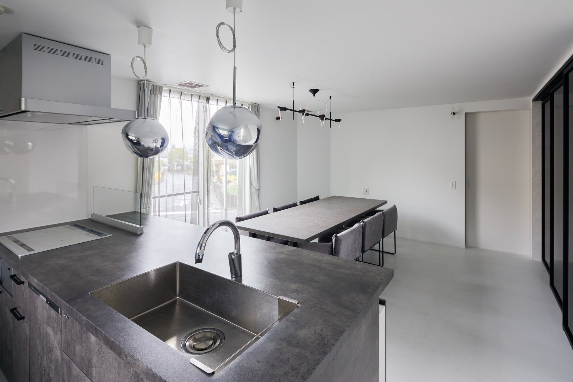 モノトーンで統一した高級感のあるシックなお住まい。キッチン上のペンダントライトは空間のアクセントに。リビングはダイニングから1段下げ、ガラス製建具で仕切ることで、空間を緩やかに仕切りながらも、つながりと奥行きのある空間になっています。
