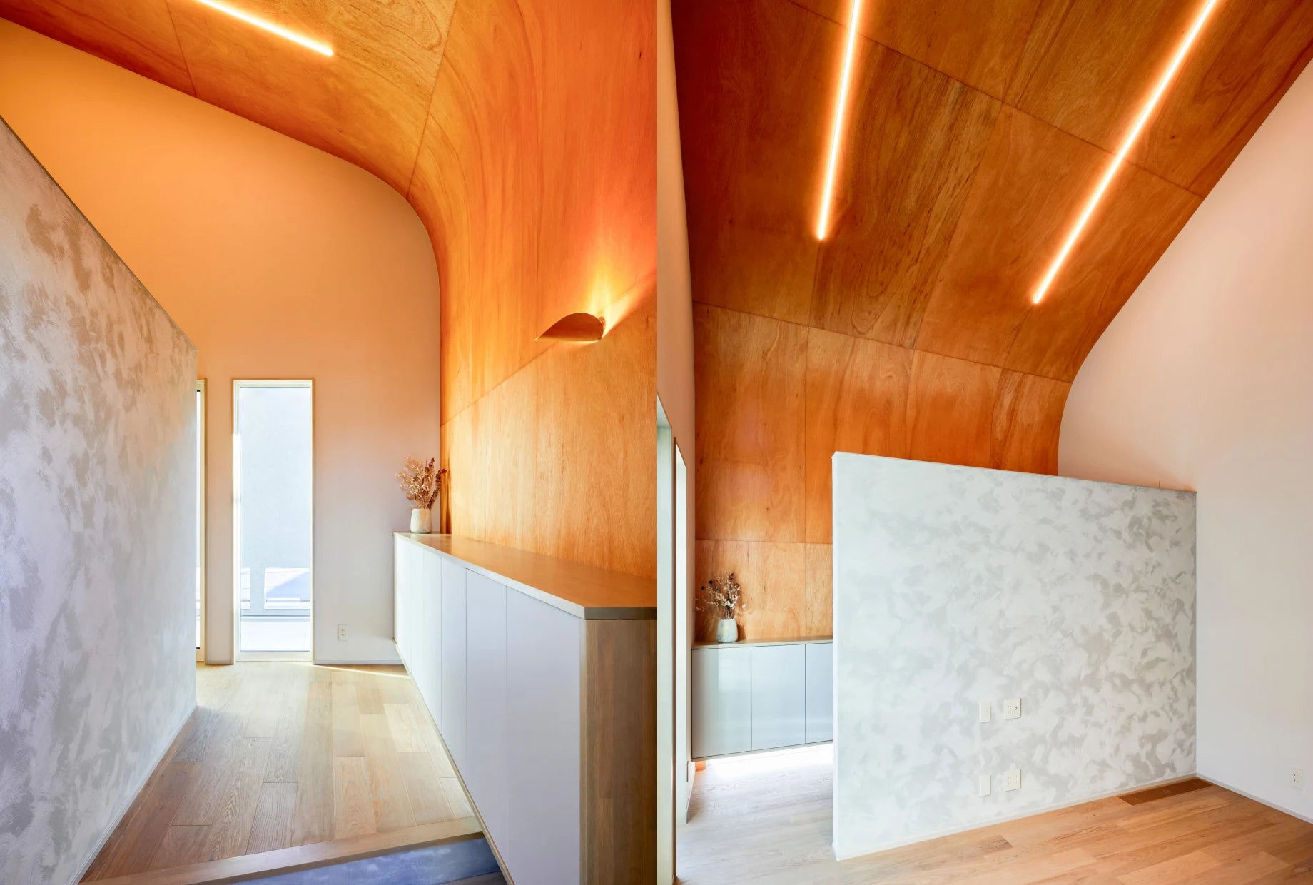 2階ホールまでつながるラワン合板のアーチ天井が印象的なお住まい。ベージュを基調としたインテリアにグレーの塗装壁を利用し、素材感を演出しています。ダイニングテーブルは、あえて木目の強いをものをチョイスすることで、空間に動きを加えました。
