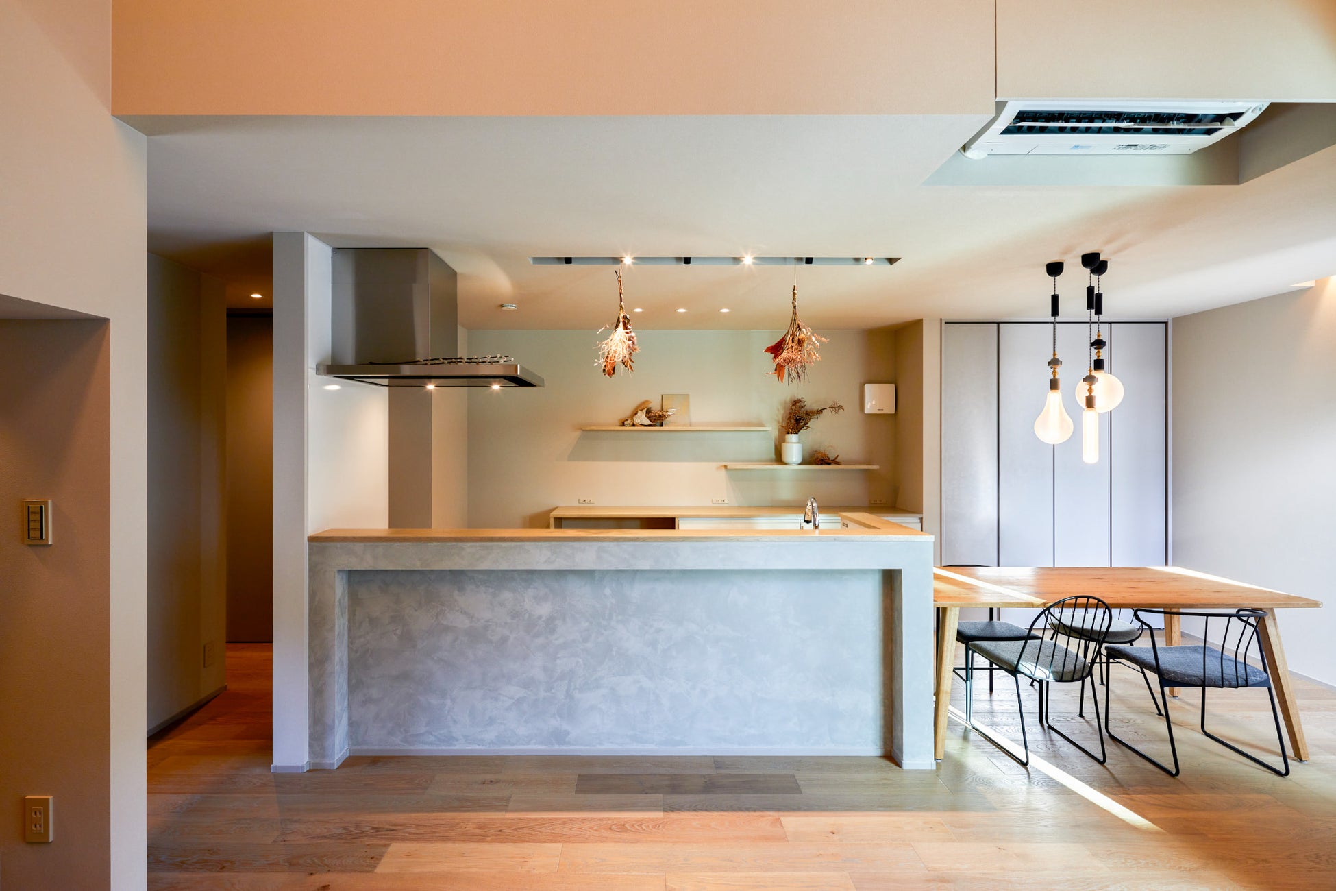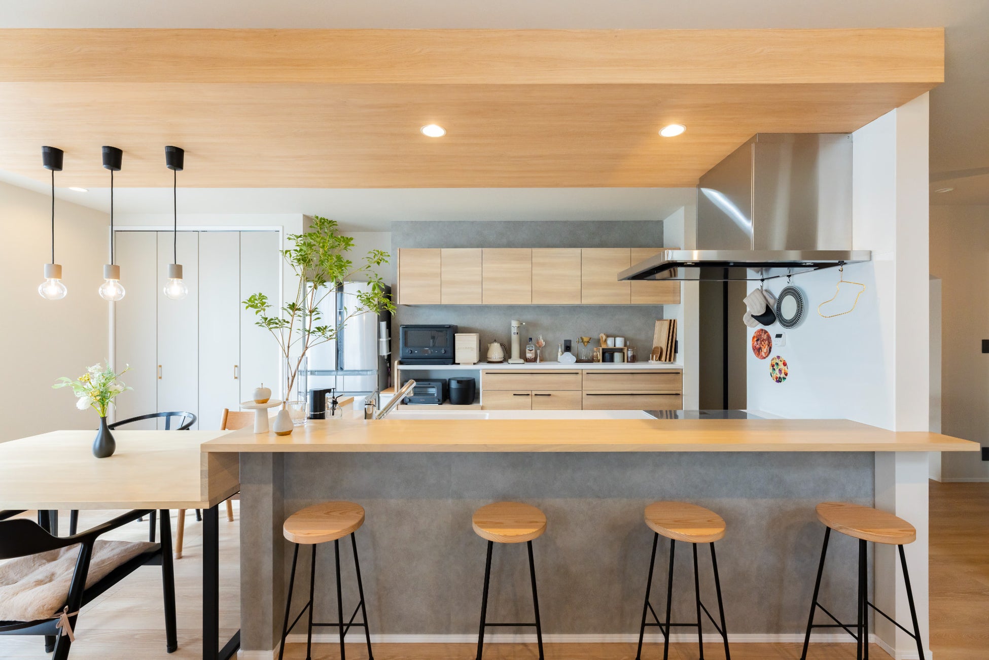 お酒やティータイムを愉しめる造作キッチンカウンターのあるお住まい。木目で合わせた折り下げ天井が非日常感を演出しています。吹き抜けのある開放的なリビングは、魅せ梁やペンダントライトで大人な雰囲気に仕上げました。