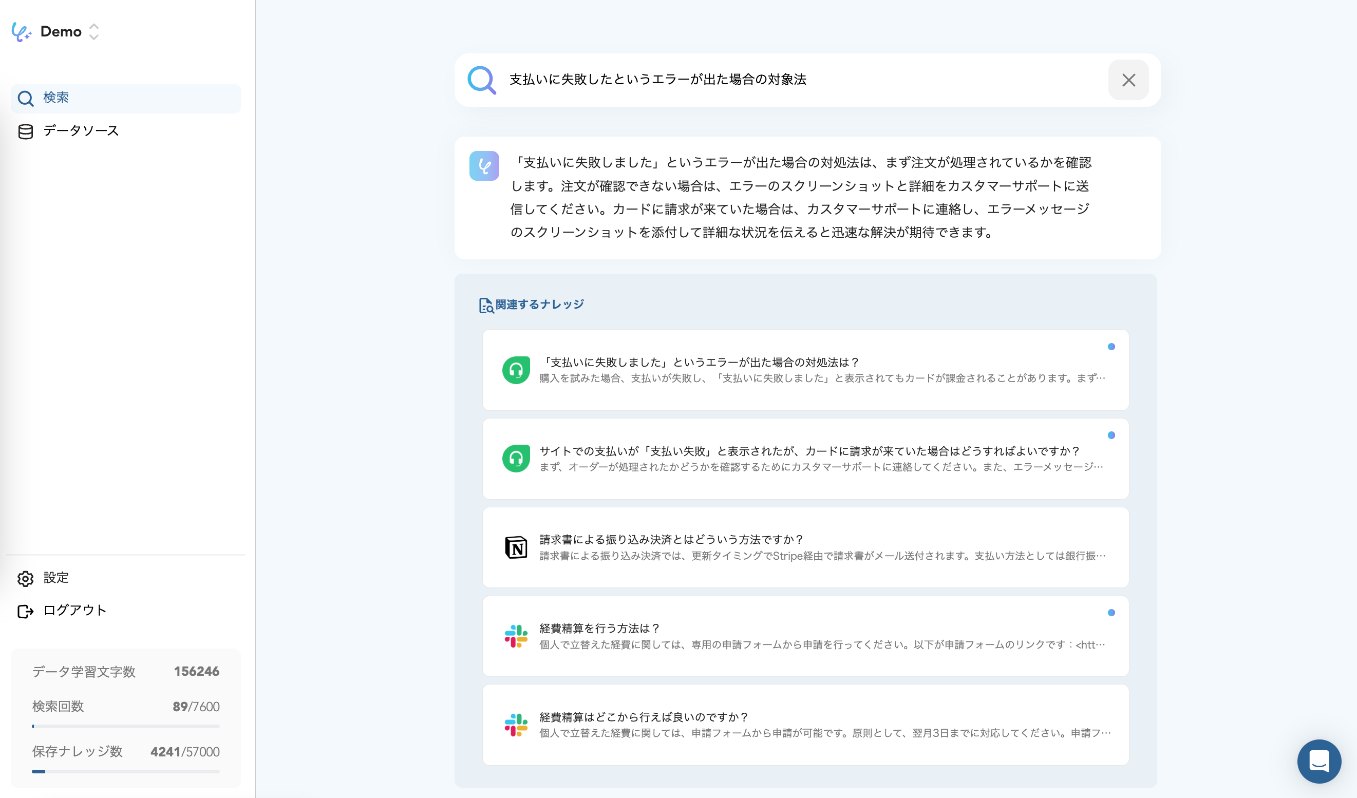 Slackなどのチャットツール内での会話情報、PDFなどのドキュメント、Notion内の記事など、様々なデータソースから社内の情報を自動的に集約します。