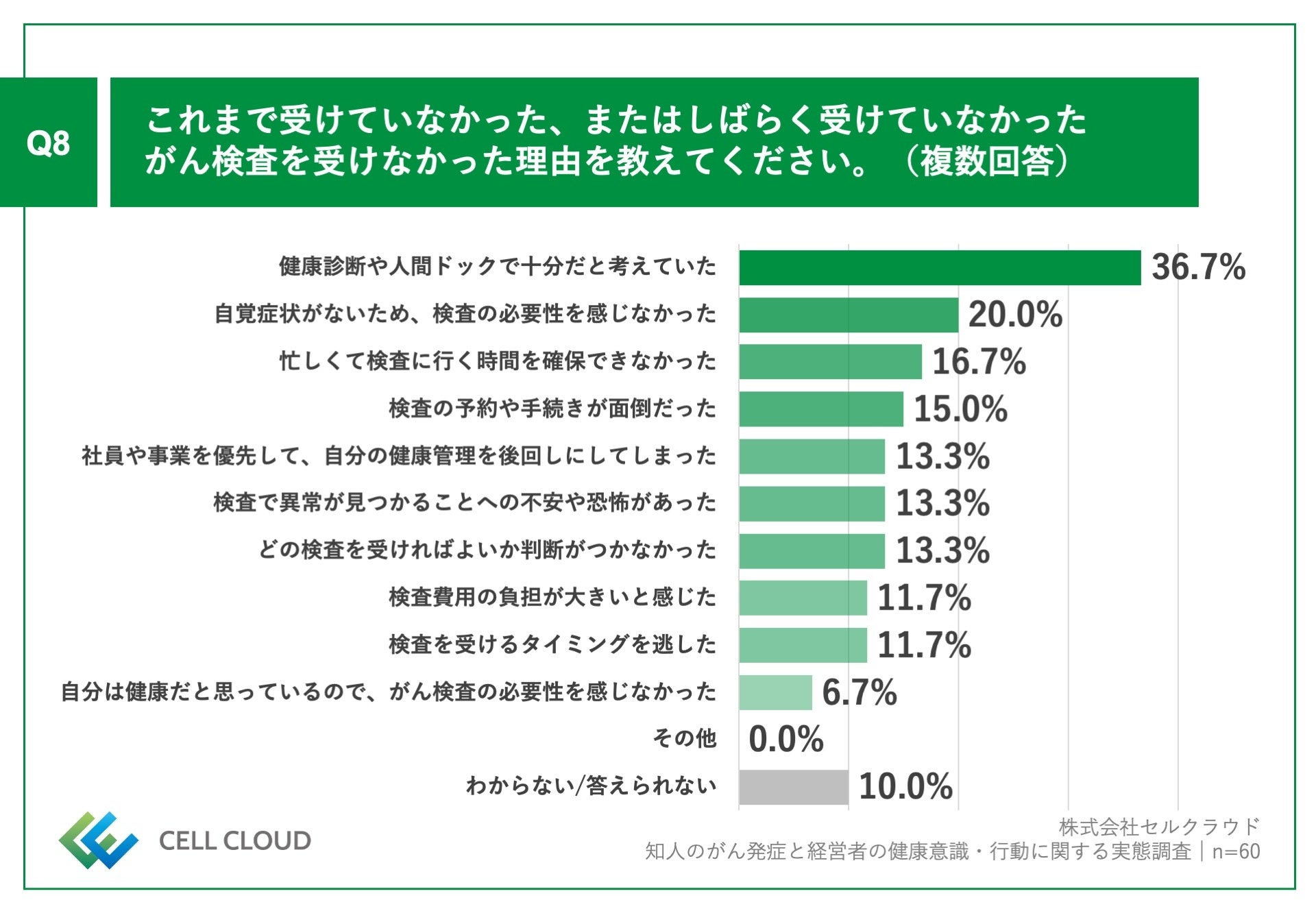 Q7で「受けていない(検討したが行動には至っていない)」「受けていない(検討もしていない)」と回答した方に、「Q8.これまで受けていなかった、またはしばらく受けていなかったがん検査を受けなかった理由を教えてください。(複数回答)」(n=60)と質問したところ、「健康診断や人間ドックで十分だと考えていた」が36.7%、「自覚症状がないため、検査の必要性を感じなかった」が20.0%、「忙しくて検査に行く時間を確保できなかった」が16.7%という回答となりました。
