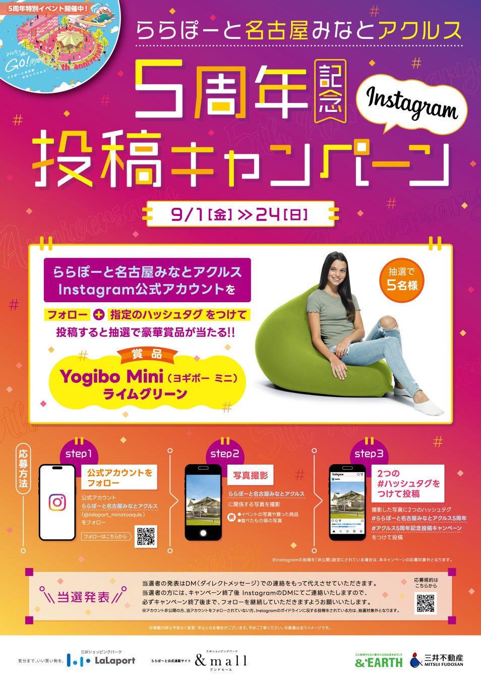 ららぽーと名古屋みなとアクルスのInstagram公式アカウントをフォローして、参加してみたいイベントや購入した商品やお食事の写真・動画を指定のハッシュタグをつけてご投稿いただくと抽選で5名さまに「yogibo mini」をプレゼントいたします!