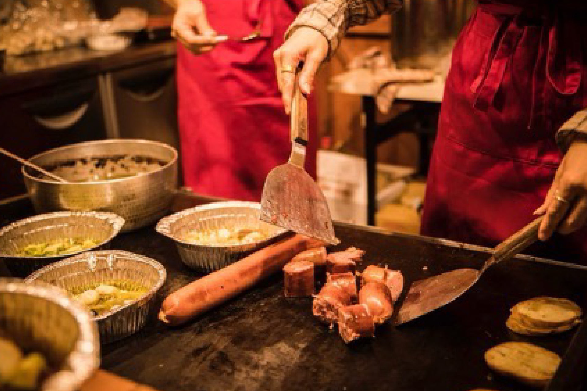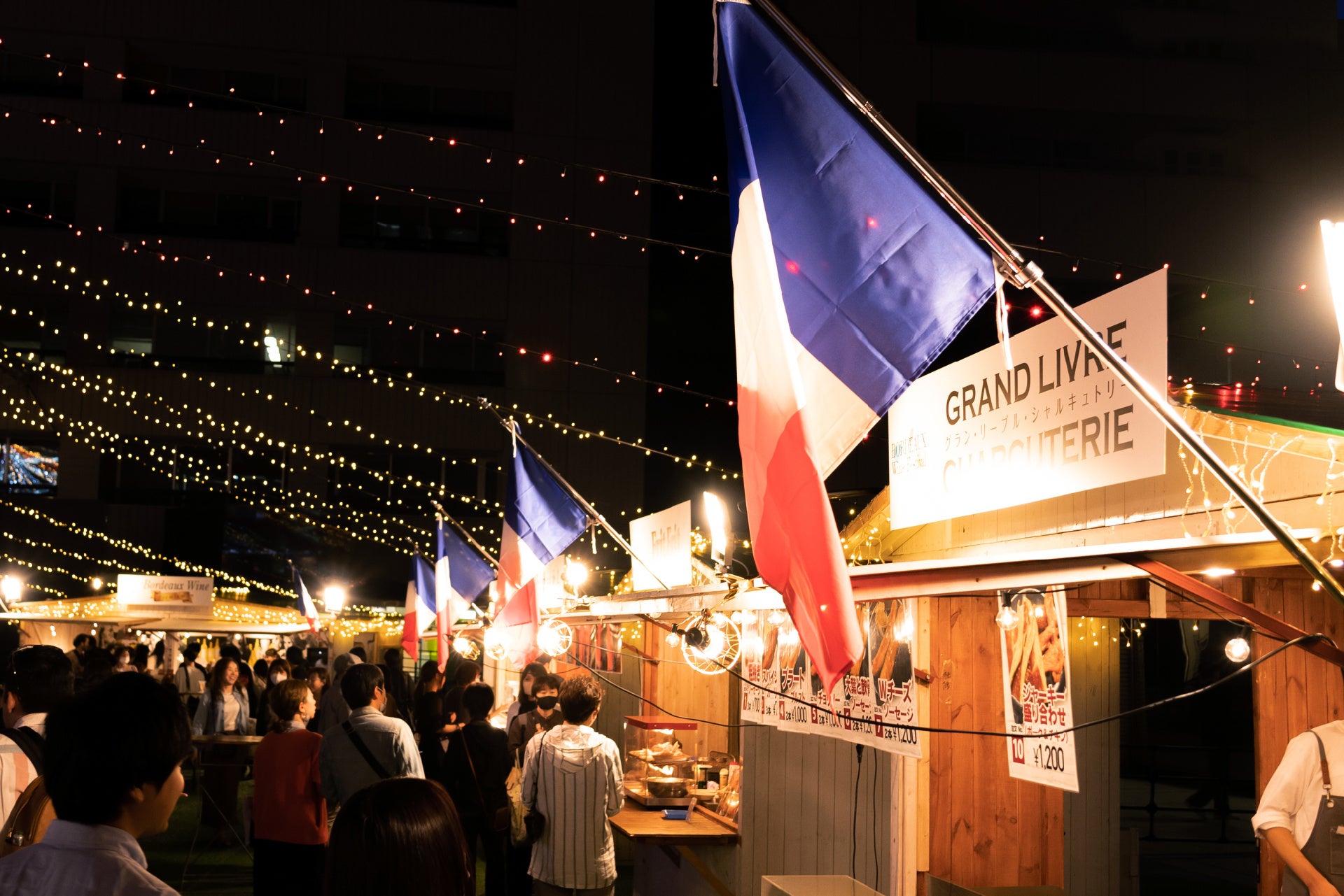 本場ヨーロッパから直輸入したヒュッテと、夜空に広がるフランス国旗の光が、まさに小洒落た路地裏のワイン酒場の雰囲気と、非日常の空間を演出します。