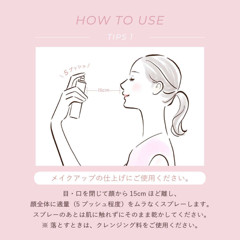 2層タイプですので、カチカチと音がするまで10回ほどよく振ってからお使いください。メイクアップの仕上げにご使用ください。目・口を閉じて顔から15cmほど離し、顔全体に適量(5プッシュ程度)をムラなくスプレーします。スプレーのあとは、肌に触れずそのまま乾かしてください。※落とすときは、クレンジング料をご使用ください。
