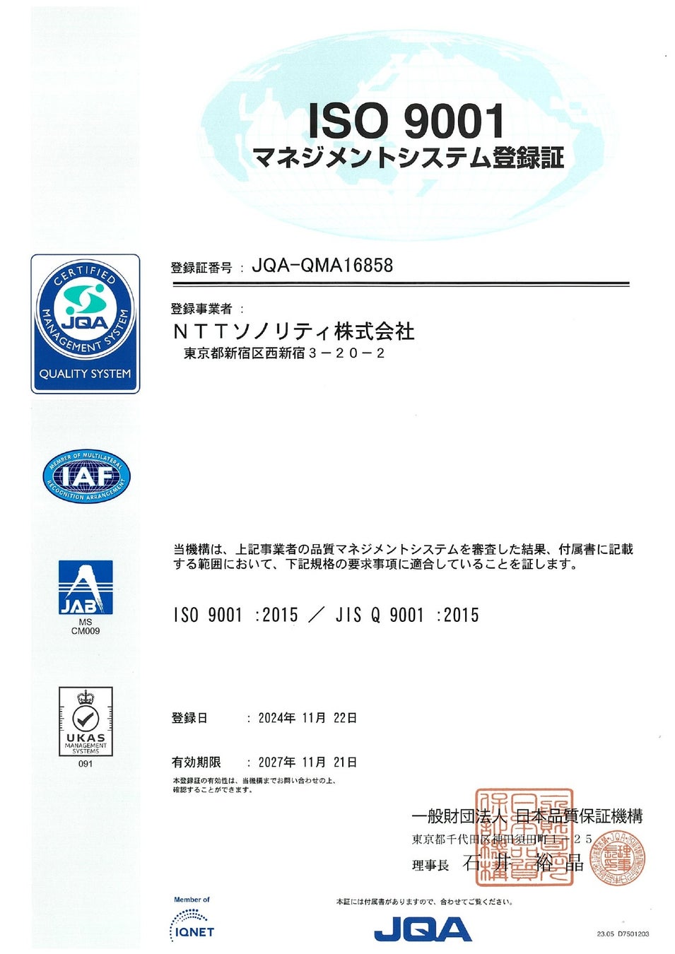 NTTソノリティ株式会社(本社:東京都新宿区、代表取締役社長:坂井 博、以下「NTTソノリティ」)は、2024年11月22日(金)に品質マネジメントシステムの国際規格ISO 9001:2015と環境マネジメントシステムの国際規格ISO 14001:2015の認証を取得しましたことをお知らせいたします。