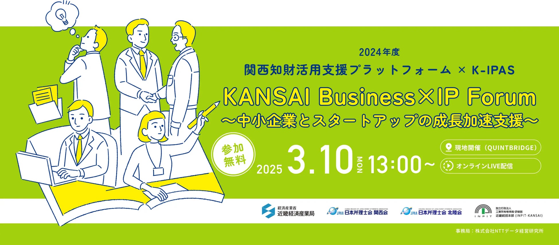 関西知財活用支援プラットフォームおよびK-IPASの成果報告会として、スタートアップや中小企業の知財戦略をテーマにしたイベント。知財の専門家による講演や、支援を受けた企業の事例紹介、ステークホルダーが持つべき知財視点についてのパネルディスカッションなどが行われます。