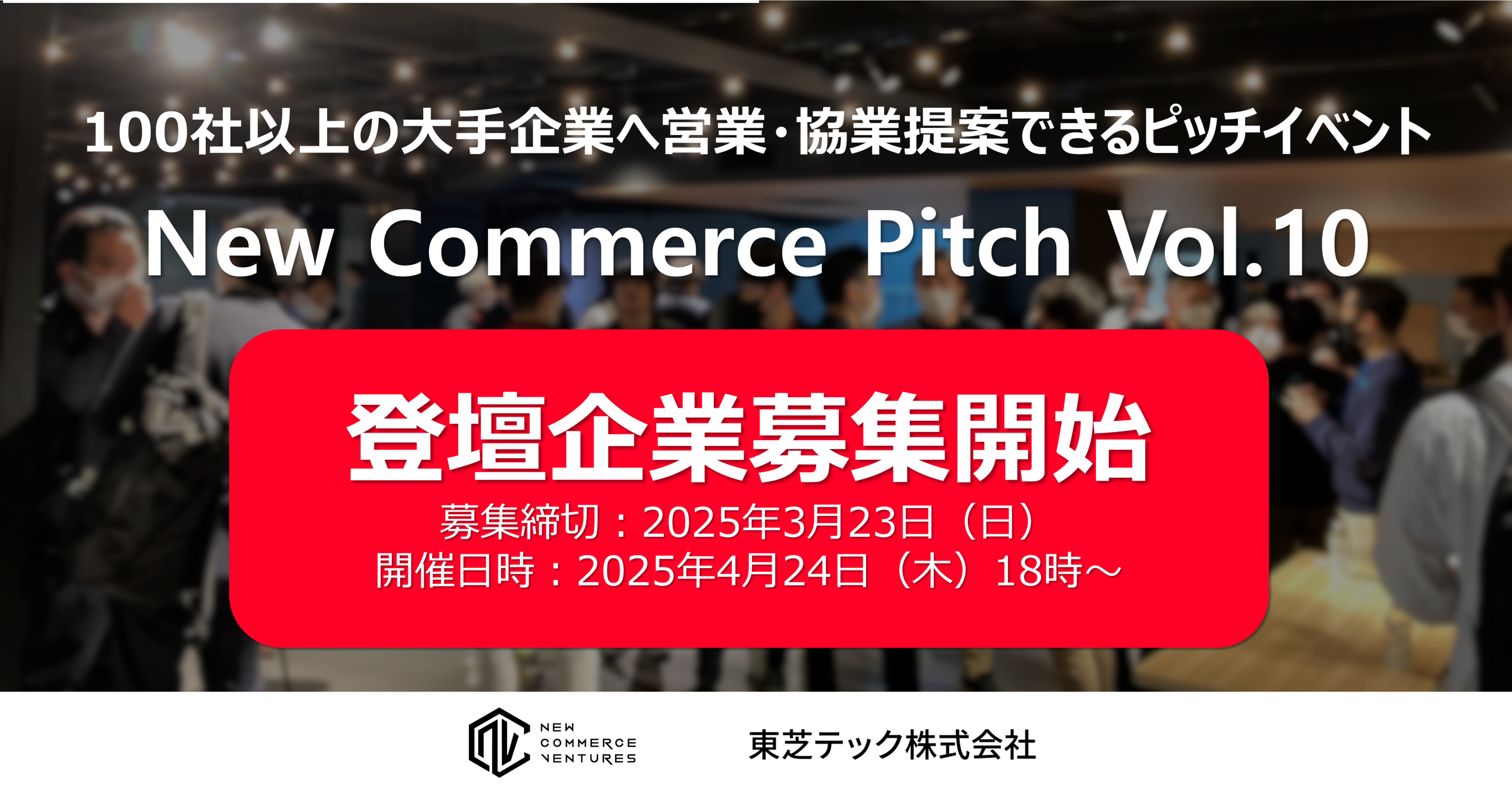 コマース・リテール領域のインダストリーベンチャーキャピタルNew Commerce Ventures株式会社(本社:東京都品川区、代表取締役:松山馨太・大久保洸平、以下NCV)は、東芝テック株式会社(本社:東京都品川区、代表取締役:錦織弘信、以下東芝テック)と共催でコマース・リテール領域のスタートアップと事業会社を繋ぐピッチイベント『New Commerce Pitch Vol.10』を2025年4月24日に開催します。これに伴い、本日よりピッチ登壇企業の募集を開始します。