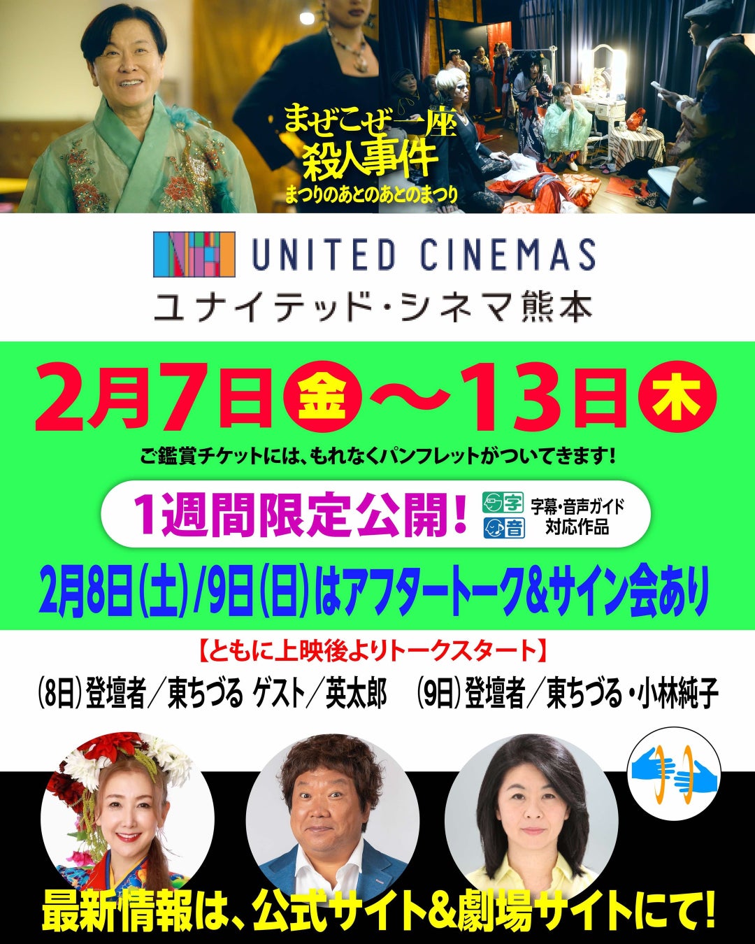 2/7〜2/13上映の「ユナイテッド・シネマ熊本」東ちづる・英太郎(ものまねタレント)・小林純子のアフタートークあり!社会派コメディサスペンス映画『まぜこぜ一座殺人事件〜まつりのあとのあとのまつり』