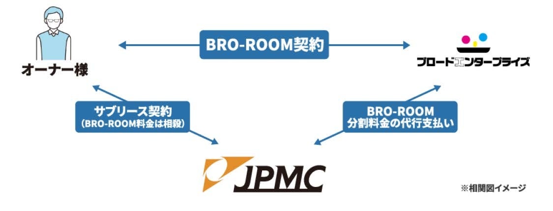 「BRO-ROOM」分割料金はサブリースの約定賃料からJPMCが相殺し、ブロードエンタープライズに代行支払い、手残り額をマンションオーナーに送金します。