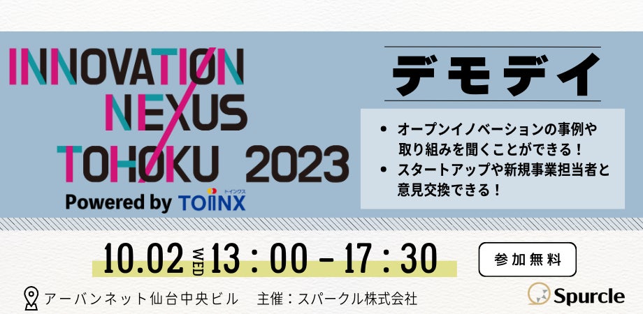 スパークル株式会社(所在地:宮城県仙台市、代表取締役:福留 秀基)はこの度、東北地域の企業と日本全国のスタートアップ企業をつなげるビジネスマッチングプログラム『INNOVATION NEXUS TOHOKU 2023』の最終イベントとして、『INNOVATION NEXUS TOHOKU 2023 デモデイ』を開催いたします。