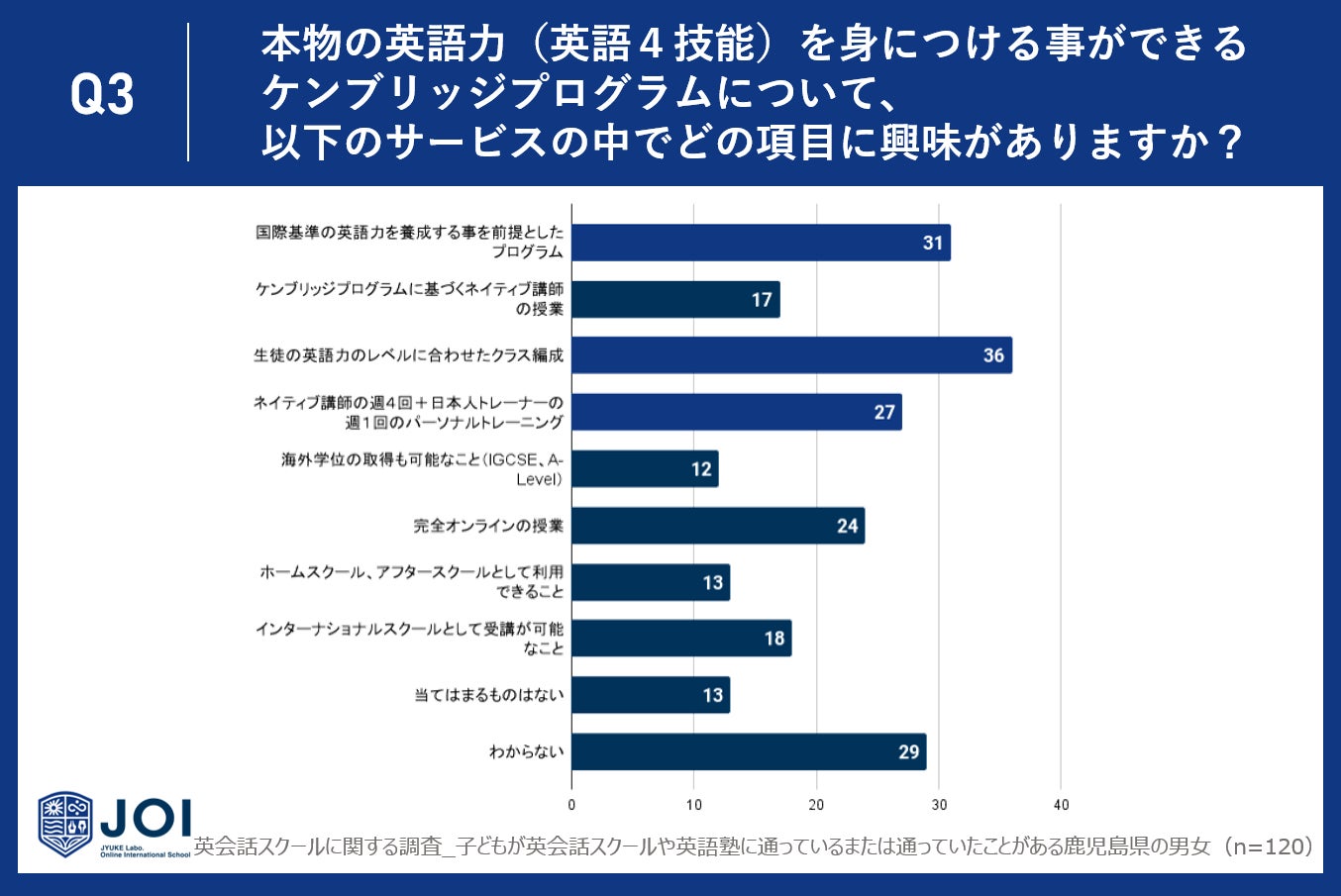 Q3で「本物の英語力(英語4技能)を身につける事ができるケンブリッジプログラムについて、以下のサービスの中でどの項目に興味がありますか?(複数回答可)」と質問したところ、鹿児島県で最も多かったのは「生徒の英語力のレベルに合わせたクラス編成」で36名でした。次いで、「国際基準の英語力を養成する事を前提としたプログラム」には31名、「ネイティブ講師の週4回+日本人トレーナーの週1回のパーソナルトレーニング」には27名が興味を持っています。一方で、「ホームスクール、アフタースクールとして利用できること」や「海外学位の取得も可能なこと(IGCSE、A-Level)」に関心を持つ人はやや少なめで、それぞれ13名、12名の回答でした。これらの結果から、多くの人は実用的な英語力の養成や個別のニーズに応じた指導に重きを置いていることが伺えます。