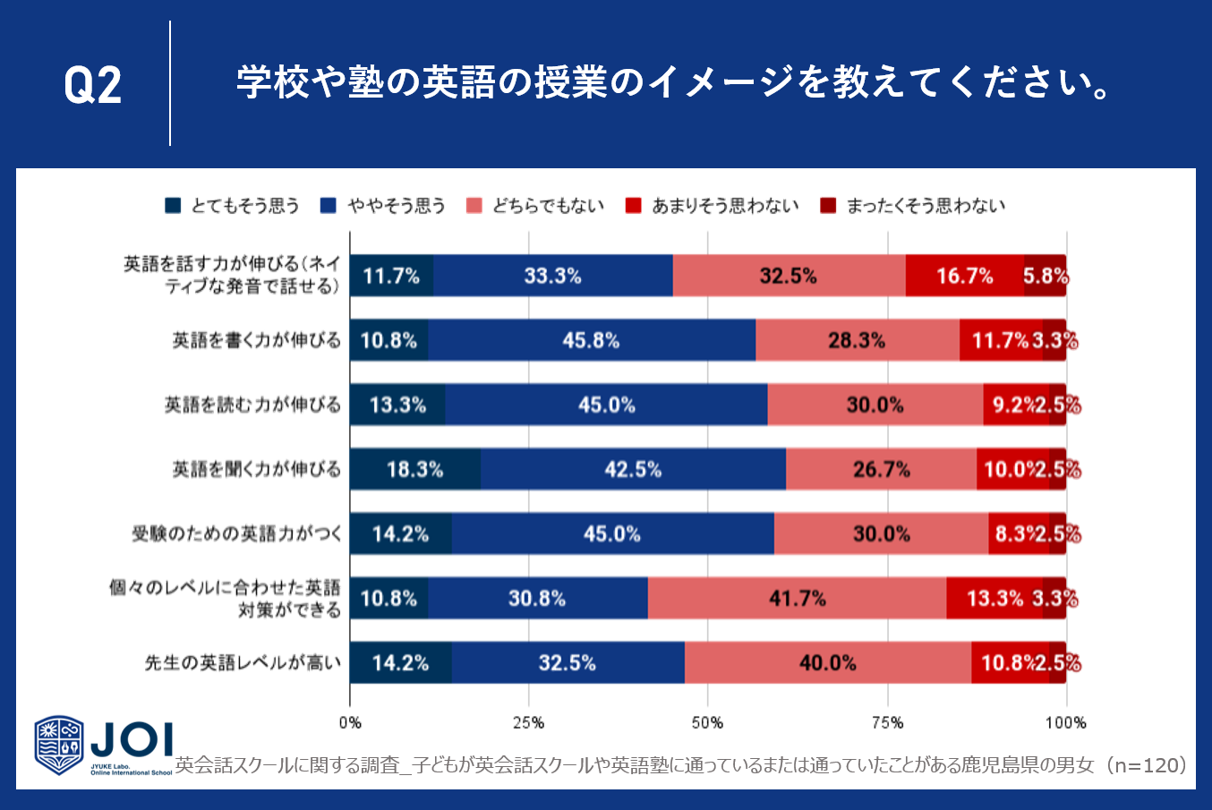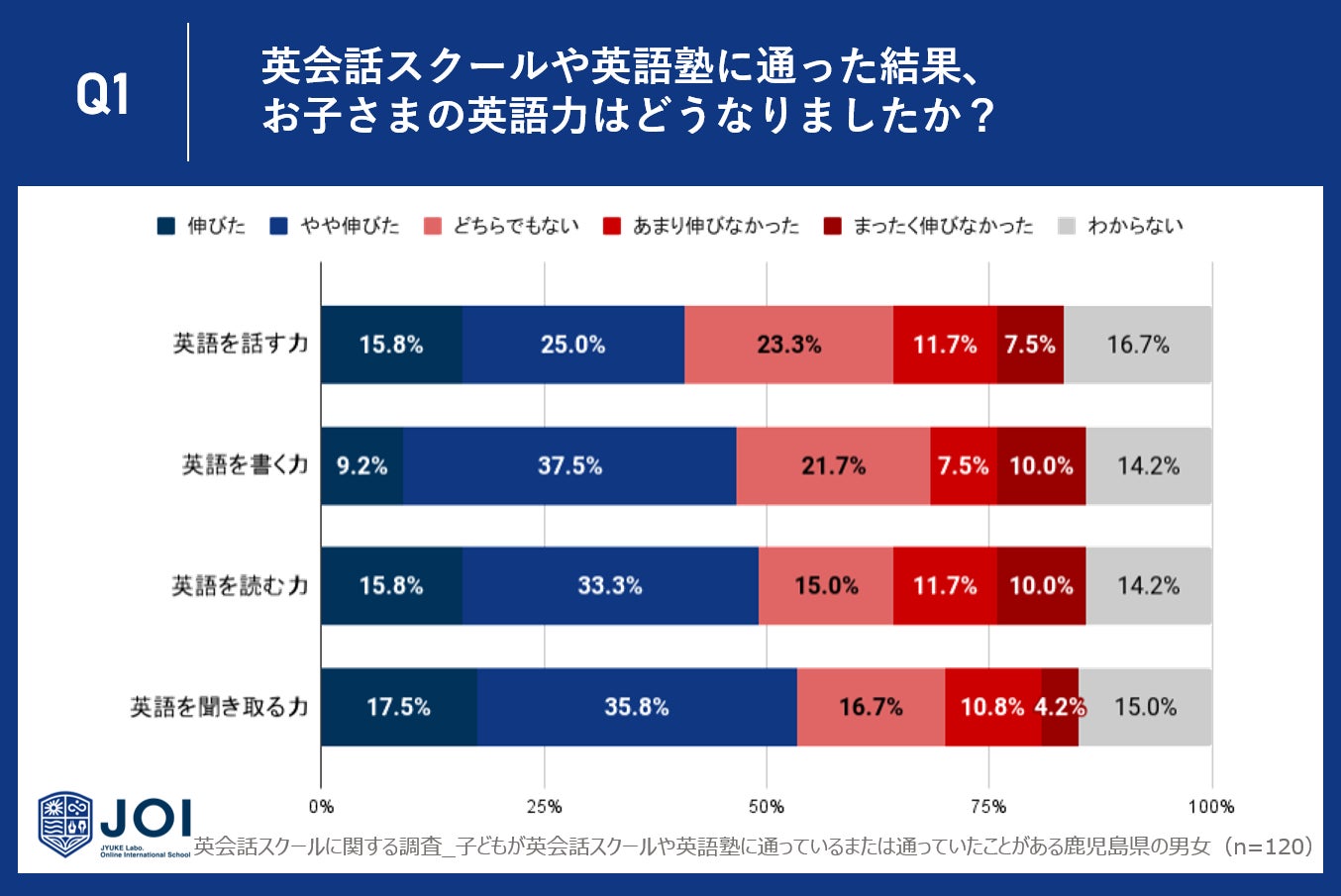 今回は、子どもが英会話スクールや英語塾に通っているまたは通っていたことがある鹿児島県の男女120人に、英会話スクールや英語塾の効果に関するアンケート調査を実施しました。